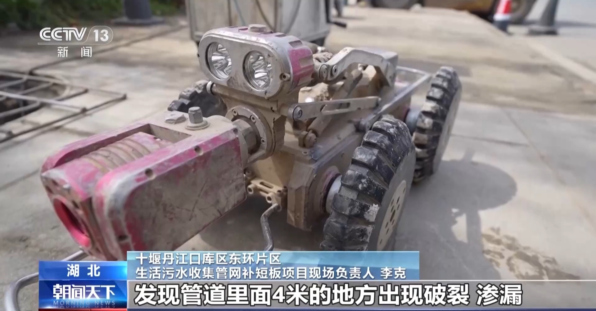 十堰丹江口库区东环片区生活污水收集管网补短板项目现场负责人李克:刚才我们通过智能机器人检测,发现管道里面4米的地方出现破裂、渗漏,在27米的地方也是一个错口,大概有40厘米宽。