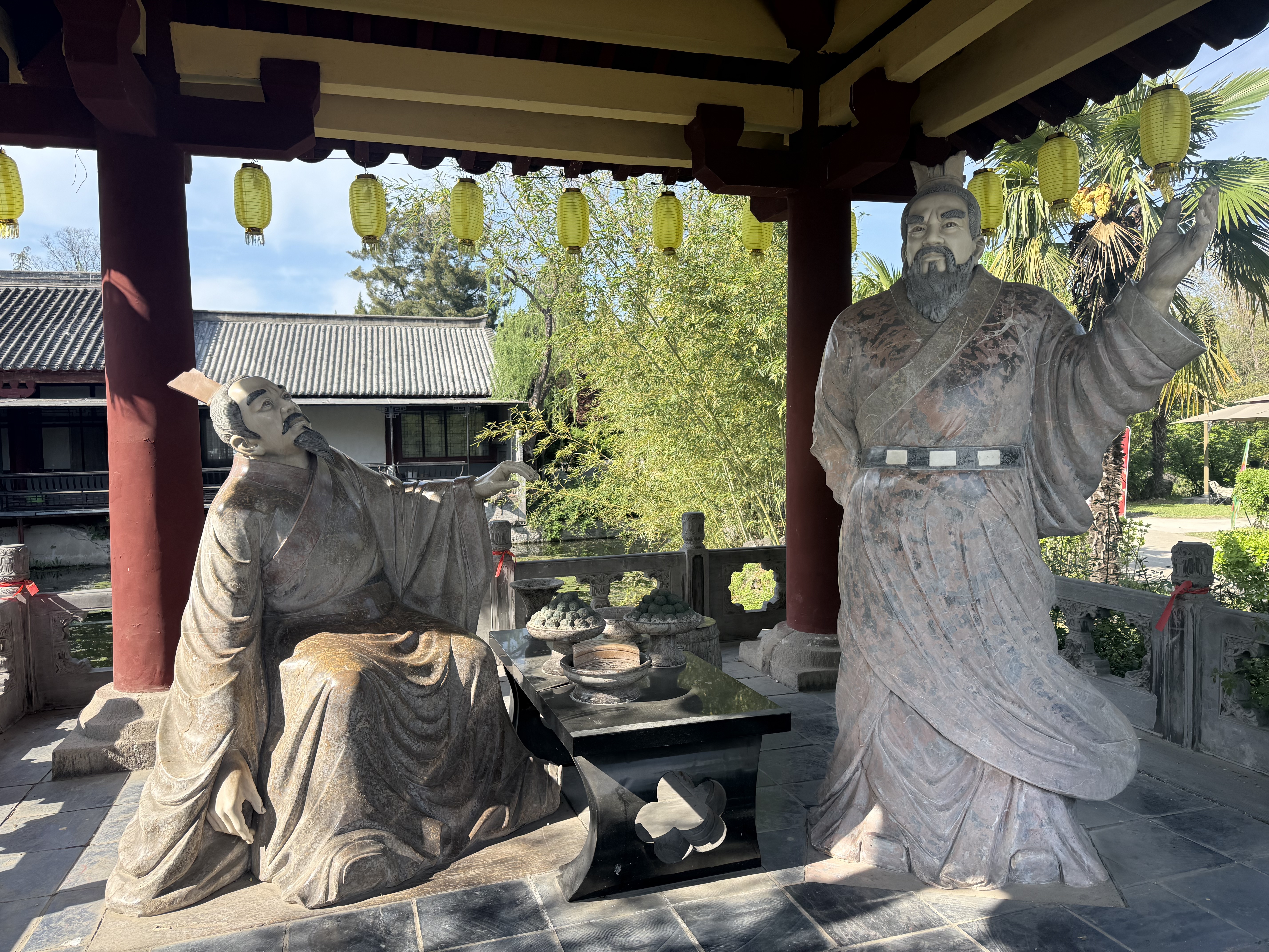 灞陵桥景区里青梅煮酒论英雄的雕像。