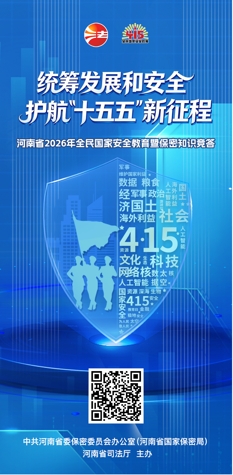 今年4月15日是第十一个全民国家安全教育日,为深入贯彻习近平总书记关于加强国家安全教育的重要指示批示精神,推动全社会提升国家安全法治意识,中共河南省委保密委员会办公室(河南省国家保密局)、河南省司法厅于2026年4月13日至17日开展全民国家安全教育暨保密知识竞答活动。