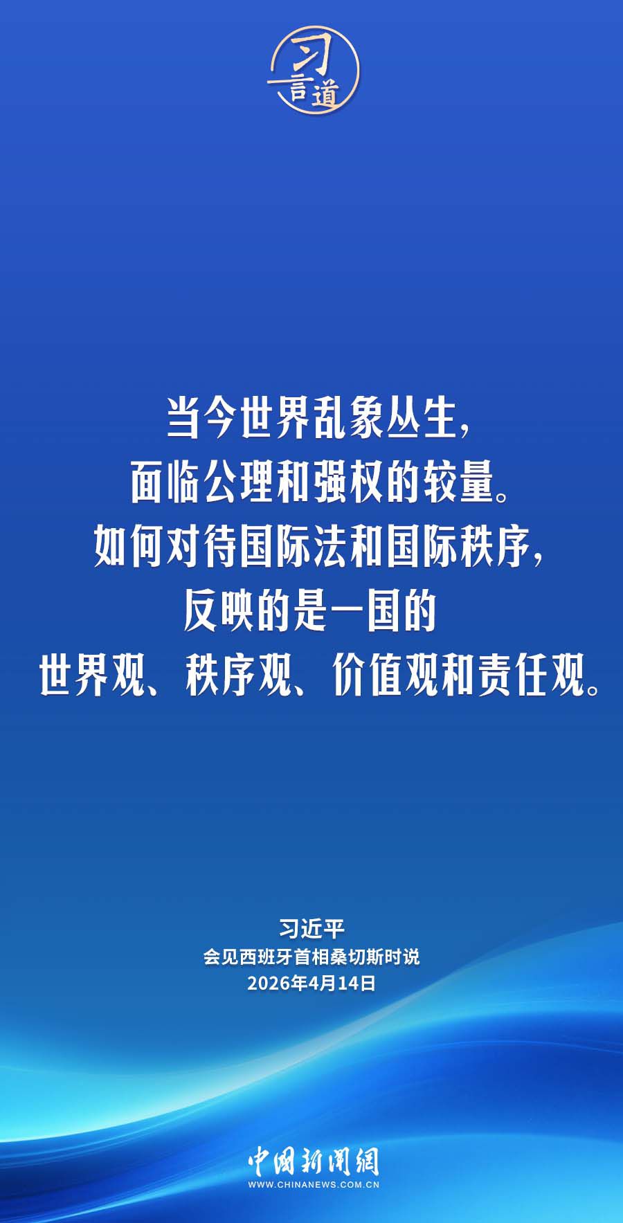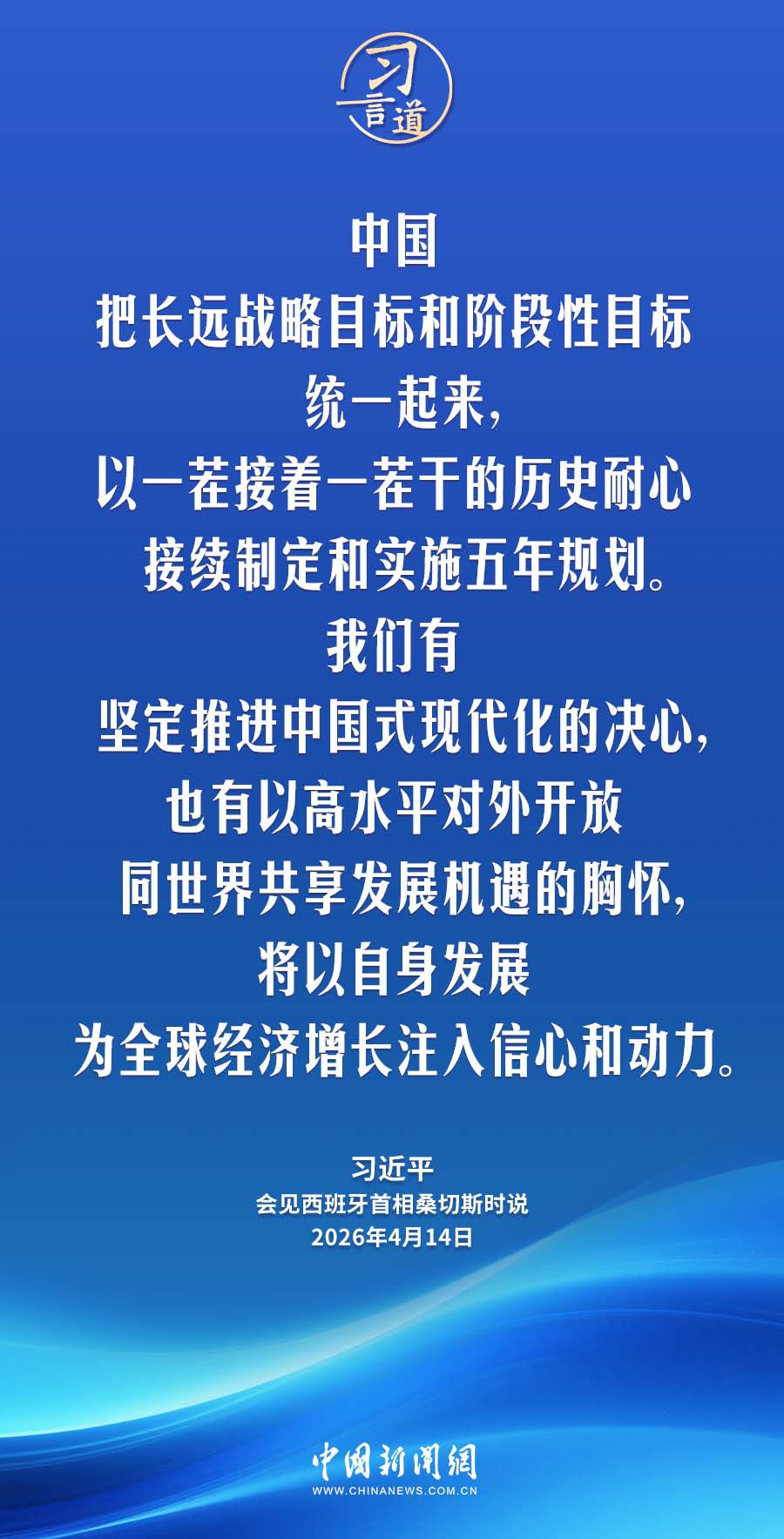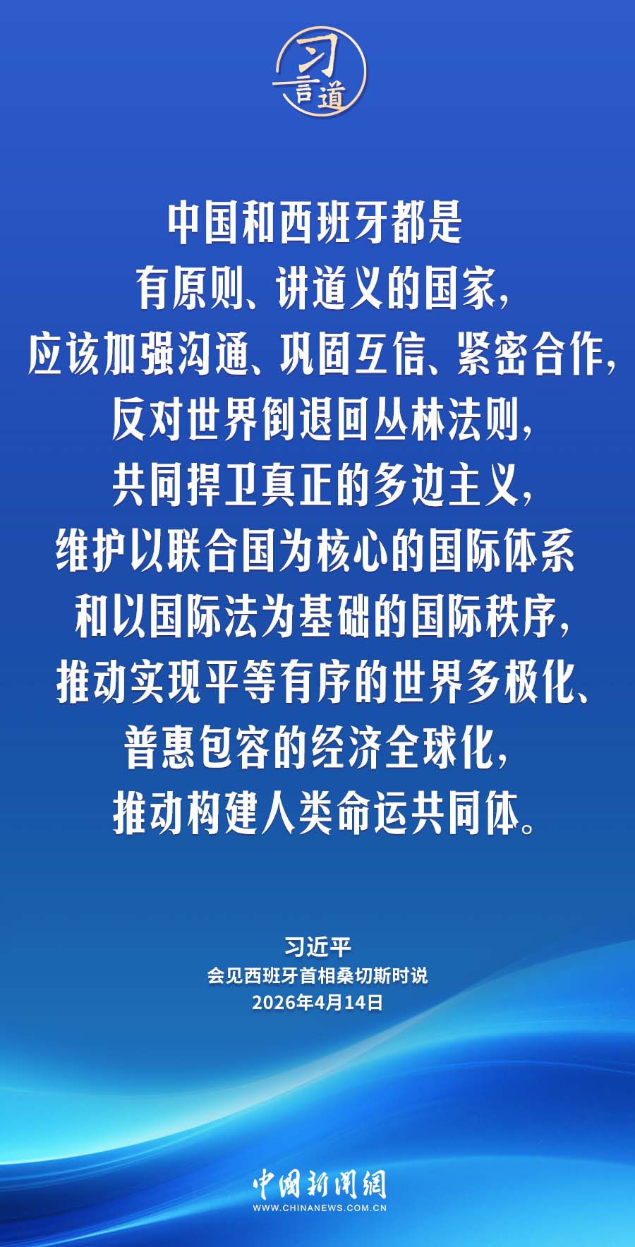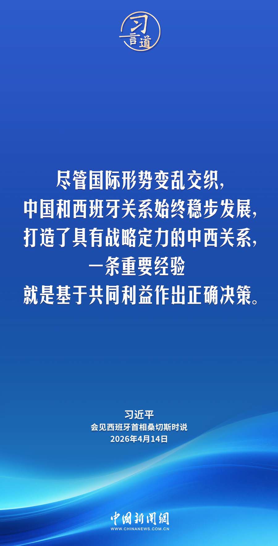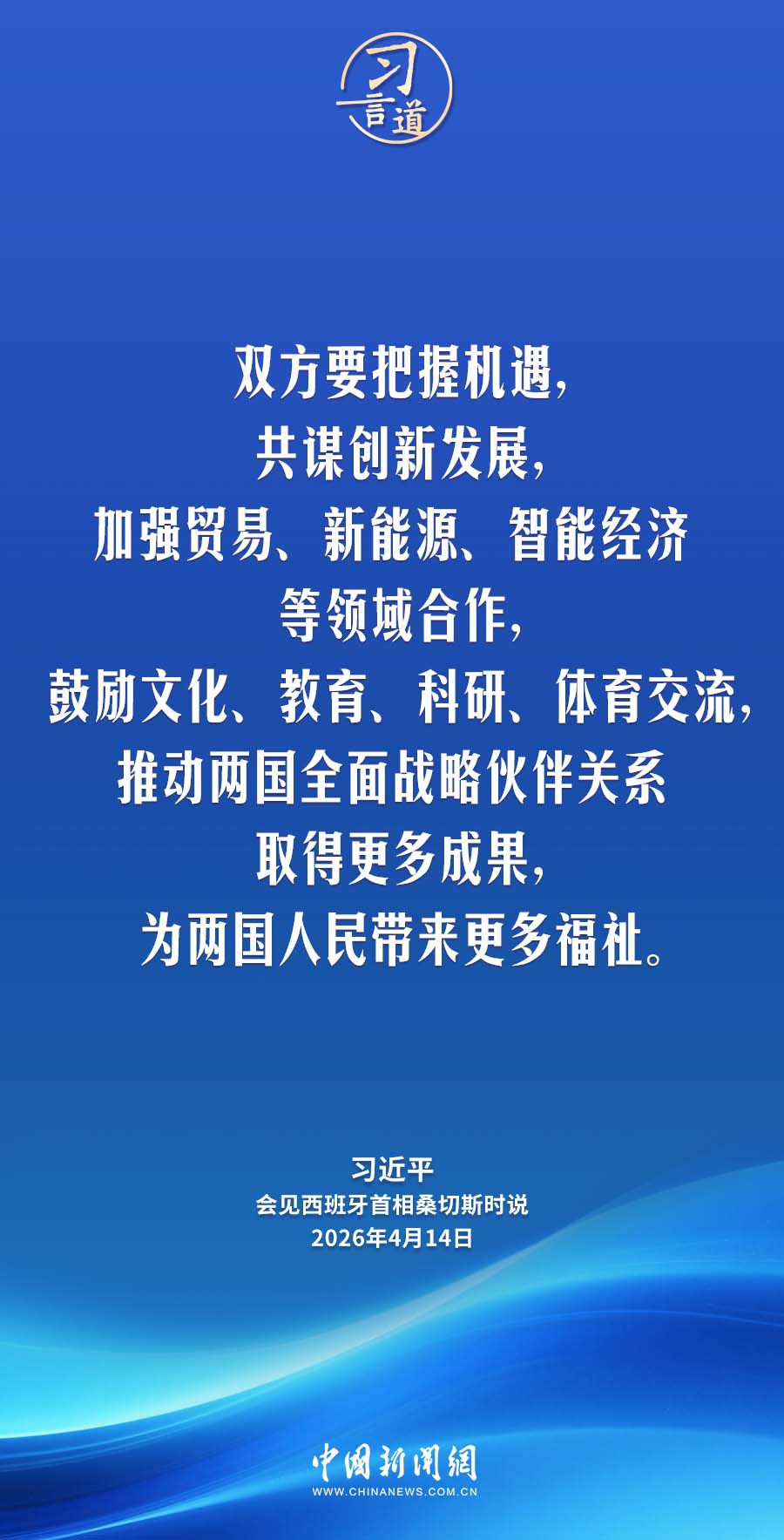 4月14日,国家主席习近平在北京人民大会堂会见来华进行正式访问的西班牙首相桑切斯。习近平指出——