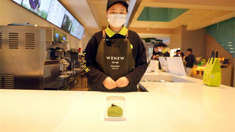 吧台旁边的冰柜里,冷藏糕点静静陈列。其中一块方形糕点是微缩的茶山,翠绿的底座上,茶垄如绿波层层漾开,沁着微微的凉意,仿佛把一座春天的茶园凝于这方寸之间。吧台正前方的点心架上,摆放着用信阳毛尖制成的茶点。一凉一暖,一创新一传统,都是信阳毛尖在舌尖上的另一种延续。