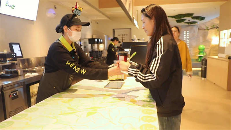 几个年轻人正围坐在休闲区轻声说笑。一个小伙举起那杯毛尖奶茶,轻啜一口说:“第一次喝毛尖奶茶就喜欢上了。茶香回甘绵长,奶味丝滑轻柔,不甜不腻,是毛尖与牛奶的完美结合,感觉不只是喝奶茶,更是把春天喝进了肚子里。”