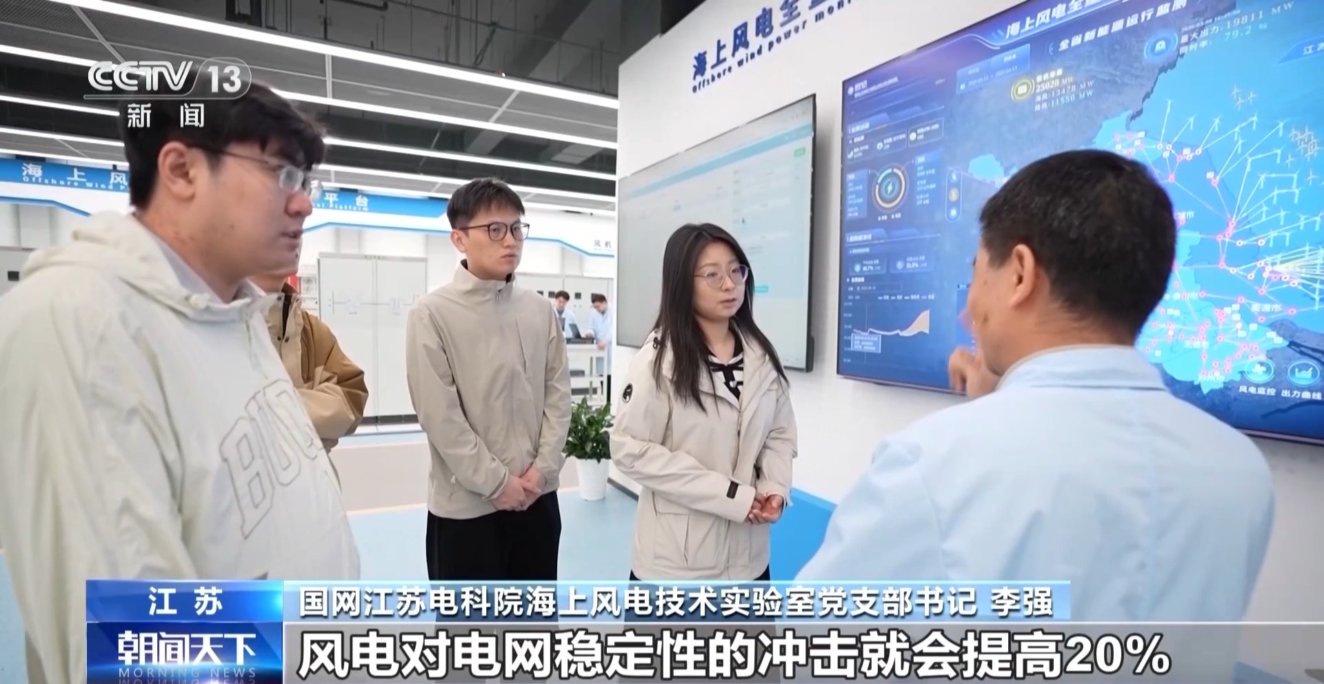 国网江苏电科院海上风电技术实验室党支部书记 李强:别看只是15公里的深远海延伸,风机离岸越远,风速资源越优。但每远离海岸10公里,风电对电网稳定性的冲击就会提高20%,目前国际上公认的并网方式,都难以解决这一难题。