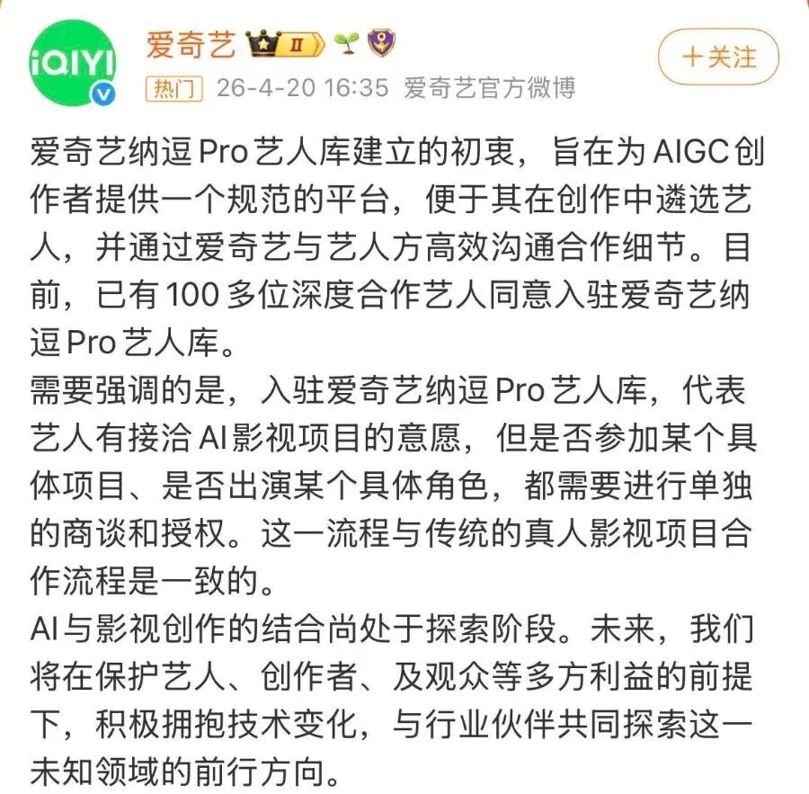 大河网讯 “真人实拍未来或成非物质文化遗产”——在2026爱奇艺世界大会上,平台宣布推出AI艺人库“纳逗Pro”,称已有超百位艺人表达AI授权合作意愿。消息随即冲上热搜。随后,多位艺人工作室紧急发布声明,均表示未签署任何AI相关授权协议。