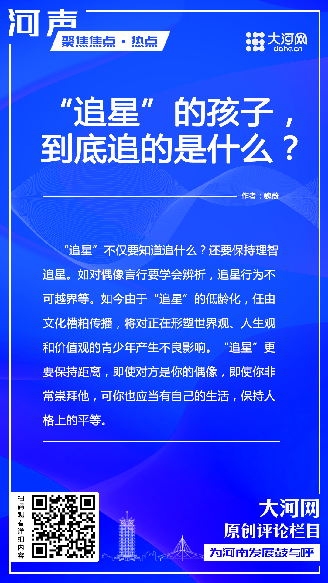 “追星”不仅要知道追什么?还要保持理智追星。如对偶像言行要学会辨析,追星行为不可越界等。如今由于“追星”的低龄化,任由文化糟粕传播,将对正在形塑世界观、人生观和价值观的青少年产生不良影响。“追星”更要保持距离,即使对方是你的偶像,即使你非常崇拜他,可你也应当有自己的生活,保持人格上的平等。(魏蔚)
