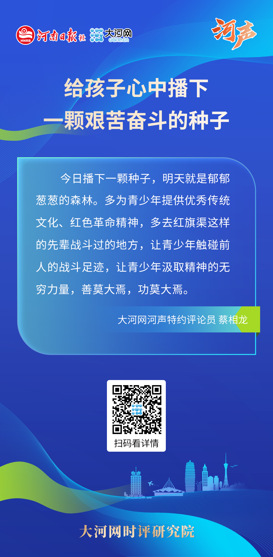 今日播下一颗种子,明天就是郁郁葱葱的森林。青少年不可能永远是青少年,他们终究要到社会上承担重任,在这个如金岁月里,告诉他们如何才不虚度、如何才不悔恨很重要。一片空旷的土地,如果你不种上庄稼,就难免会长满野草,所以,各方都要深耕细作,多为青少年提供优秀传统文化、红色革命精神,多去红旗渠这样的先辈战斗过的地方,让青少年触碰前人的战斗足迹,让青少年汲取精神的无穷力量,善莫大焉,功莫大焉。(大河网河声评论员蔡相龙)