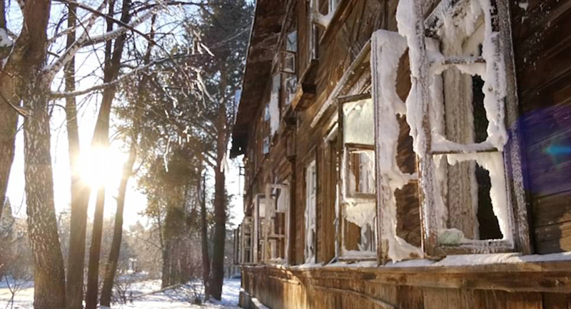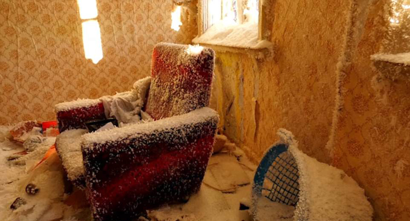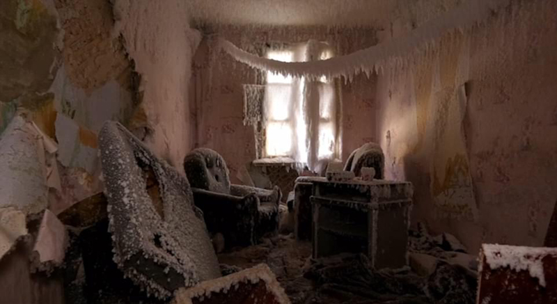 俄罗斯废弃房屋内外被冰雪包裹如冰雪宫殿