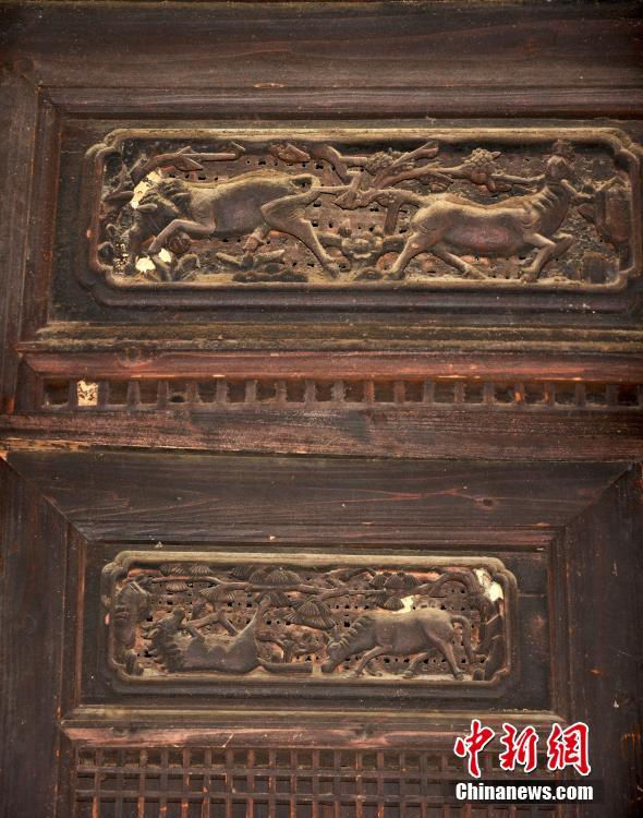 举人府一扇门上的雕刻,上图寓意马放南山,下图中一只马倒着,寓意马到成功。(拼接图) 叶茂 摄