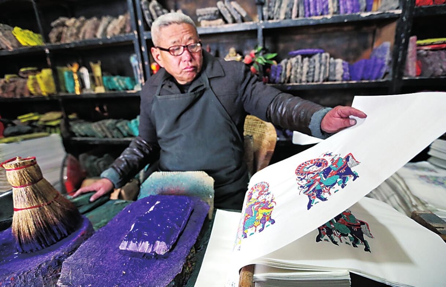 三间屋大小的万同老店货架上,整齐地码着一块块木版,“我们店里存的木版有1000多块,结合时代还创作了一些糅合进现代特色的新版,比如12生肖。为了节约板材,正反都会刻上画面,正好是一对。另外,紫色用得比较多,比较突出,紫色在河南戏曲里面代表忠义正直。印制年画对刻版和印刷的技术要求很高,一线之间对不齐,颜色就可能串色。”白院长很自豪。