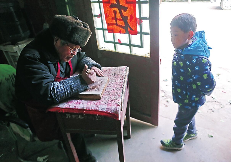 小男孩好奇地背着双手认真观看张连生老先生雕刻木版画