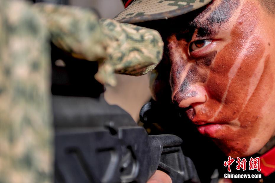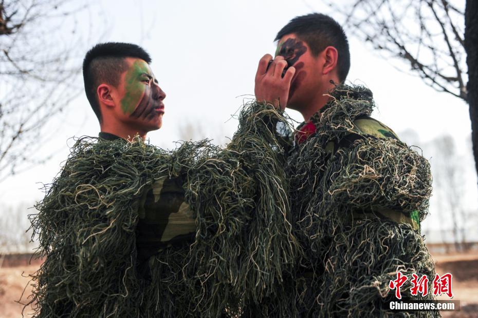 武警狙击手们进行面部伪装。袁浩翔 摄
