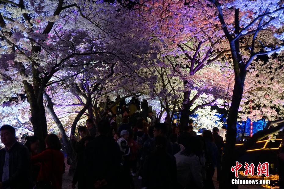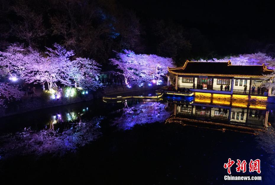 在各色彩灯及人工水雾的“支持”下,鼋头渚绽放的樱花“别具特色”。 孙权 摄