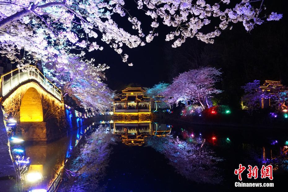3月27日晚,“中华赏樱胜地”无锡太湖鼋头渚内,盛开的樱花在灯光的照射下,岸上的花朵与水中的景象虚实更替,绚烂之美犹如画卷一般,展现了别样的“妩媚”,吸引了众多爱花、爱景的游客们前来夜游畅玩。 孙权 摄