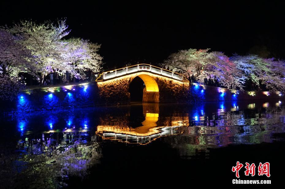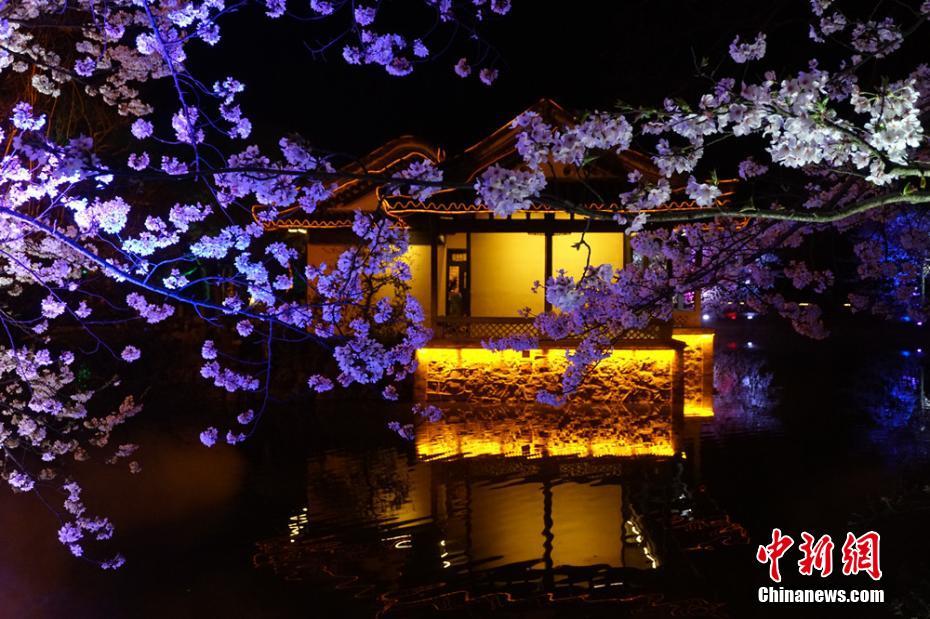 水面的倒影,让夜色中的樱花与景观更显“妩媚”魅力。 孙权 摄