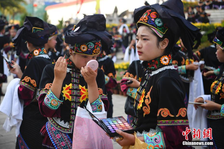 4月1日,演员上场前补妆。当日,云南省文山壮族苗族自治州建州60周年庆祝活动举行。文山壮族苗族自治州是著名的三七之乡。