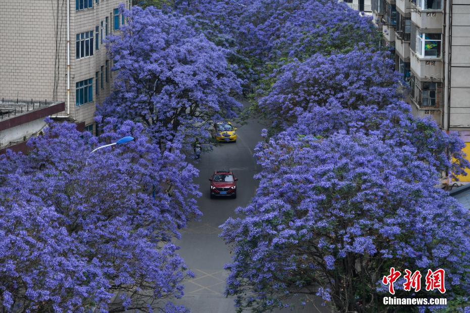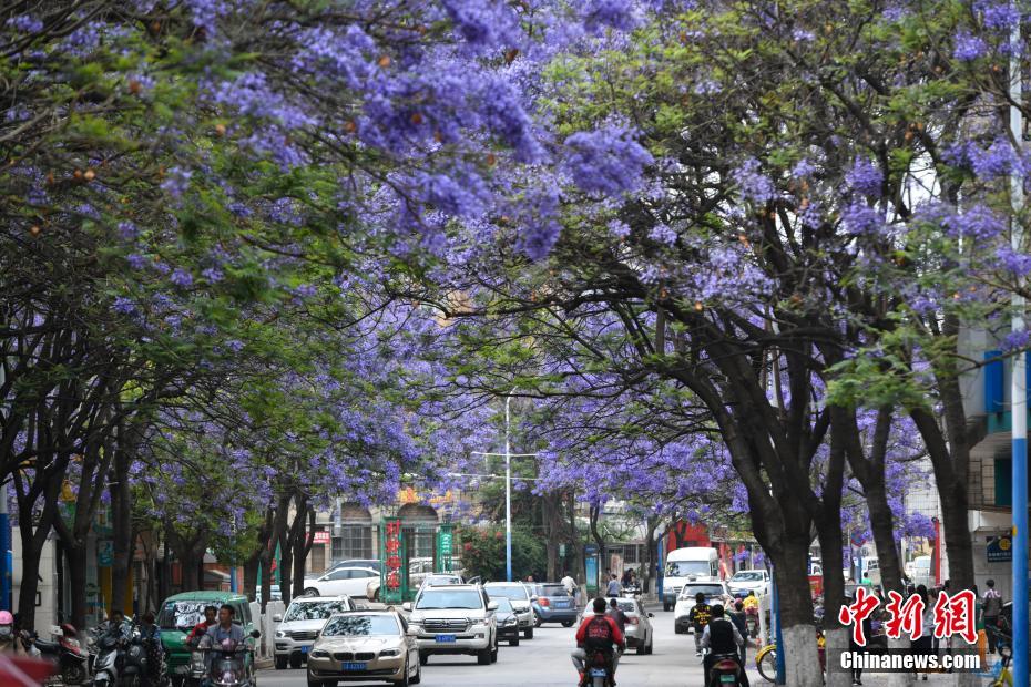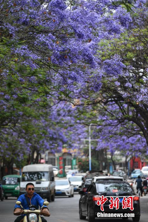 5月2日,昆明市区一道路两旁的蓝花楹盛开,车辆在“花街”穿行。 中新社记者 任东 摄