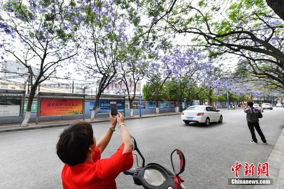 5月2日,昆明市区一道路两旁的蓝花楹盛开,民众在“花街”穿行。 中新社记者 任东 摄
