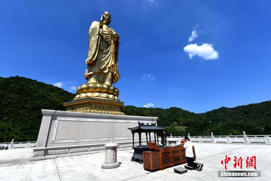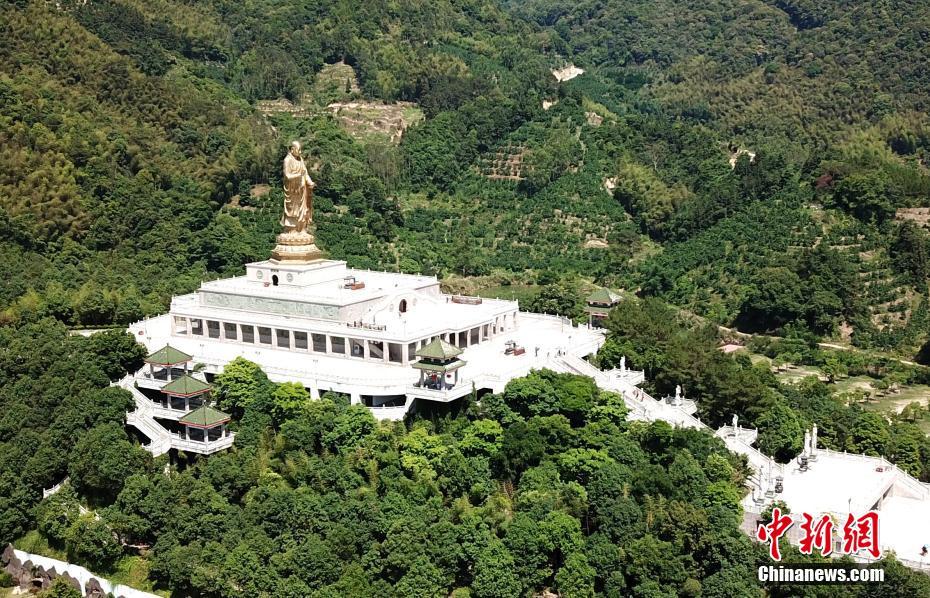 5月17日,记者探访闽南千年古刹――平和三平寺。三平寺地处福建漳州市平和县文峰镇境内,为晚唐高僧杨义中禅师于唐会昌五年(公元845年)创建,至今已有1173年历史。三平祖师文化影响深远,信众遍布36个国家和地区,在海内外的分庙达350多家。图为空中鸟瞰三平祖师文化园里的巨型祖师爷铜像,高度达22.88米。中新社记者 吕明 摄