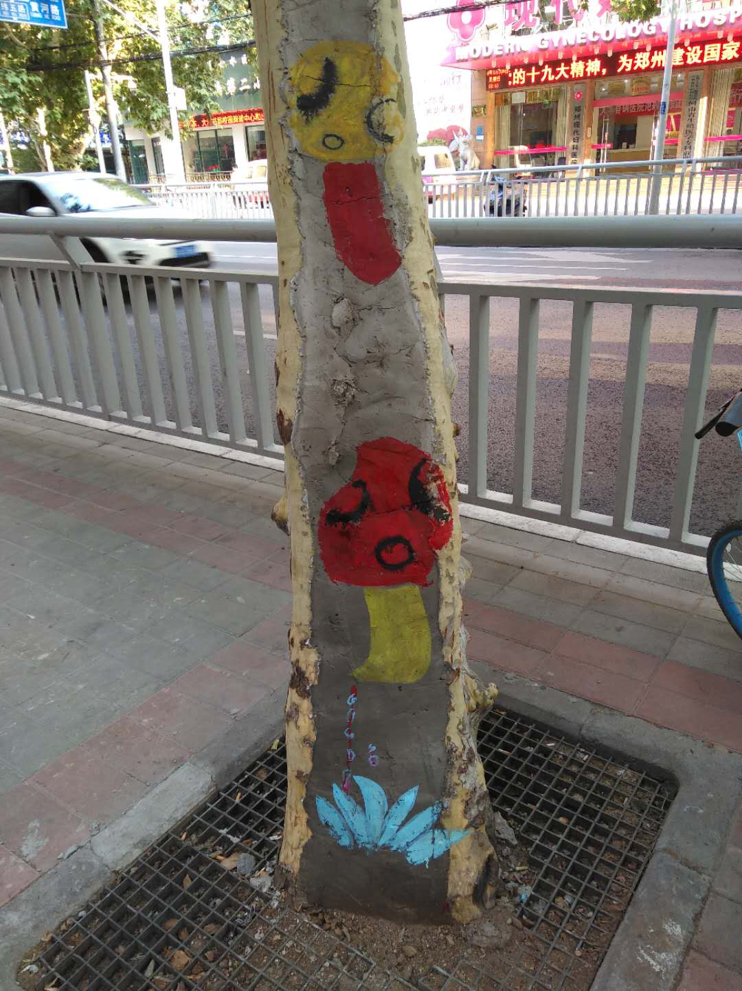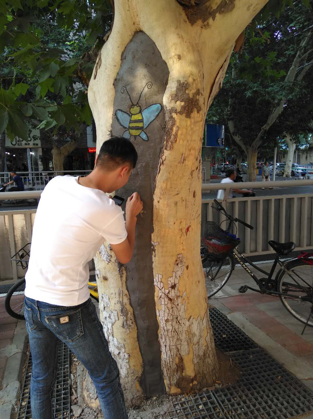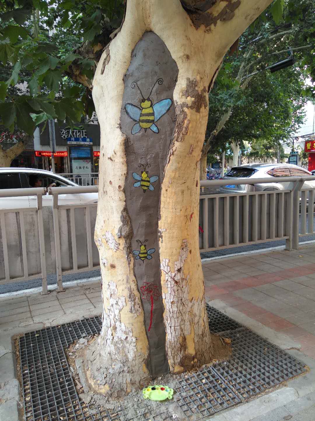 纬五路上的空洞树已经修复,工人在修补处画上卡通画