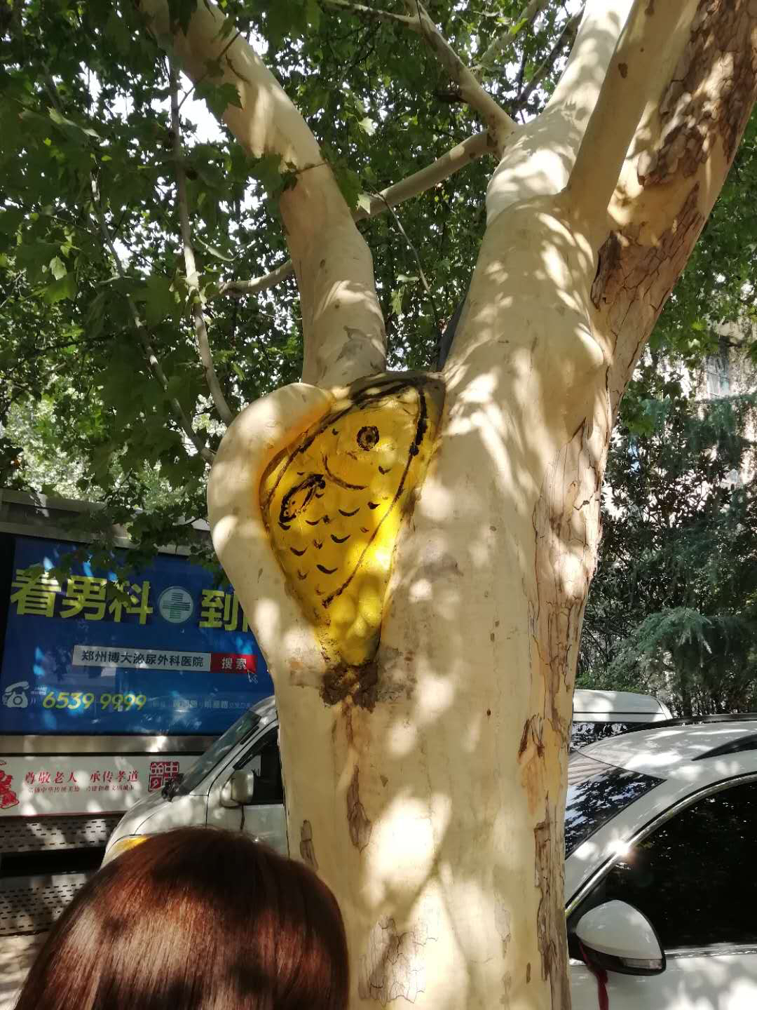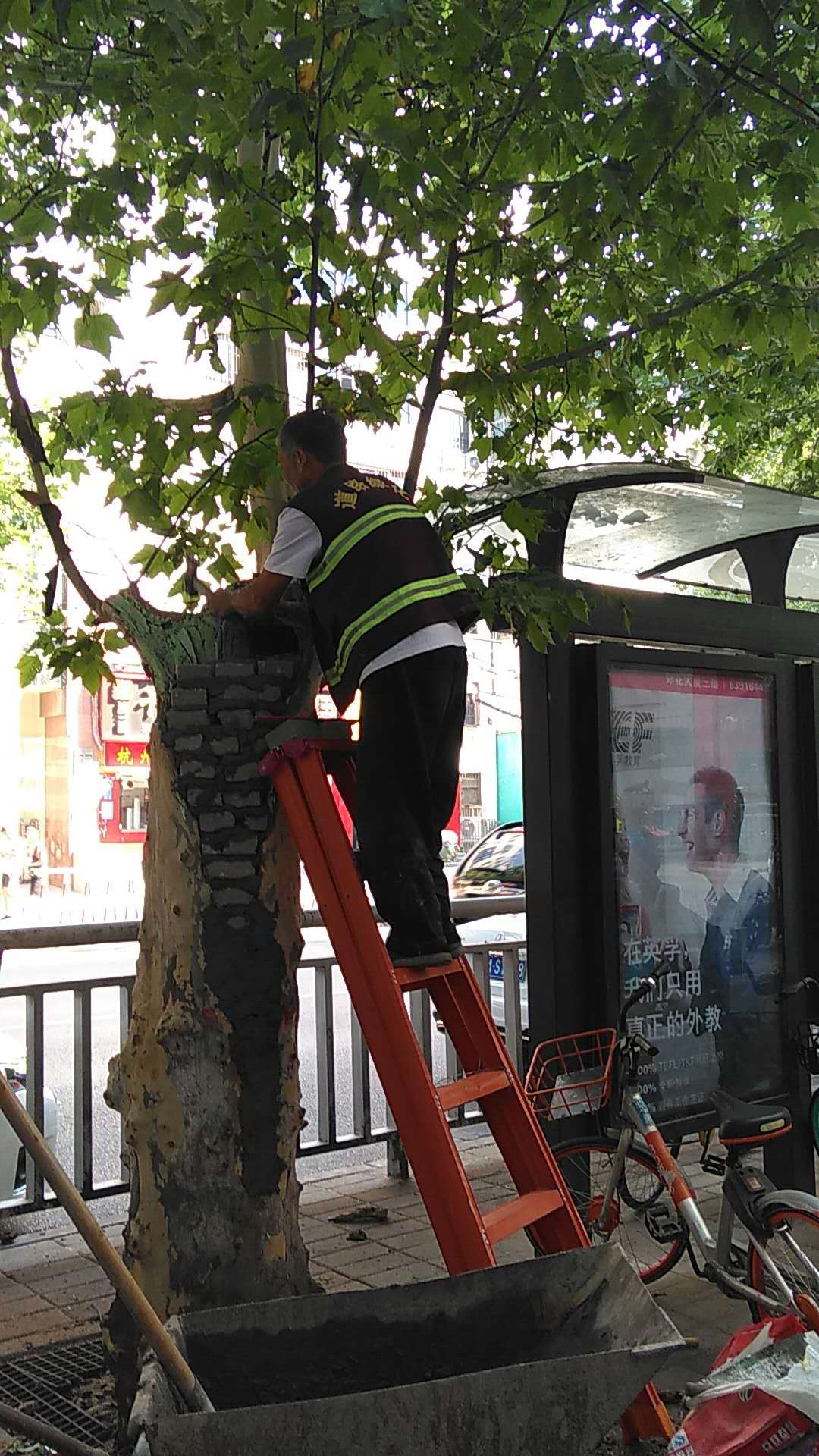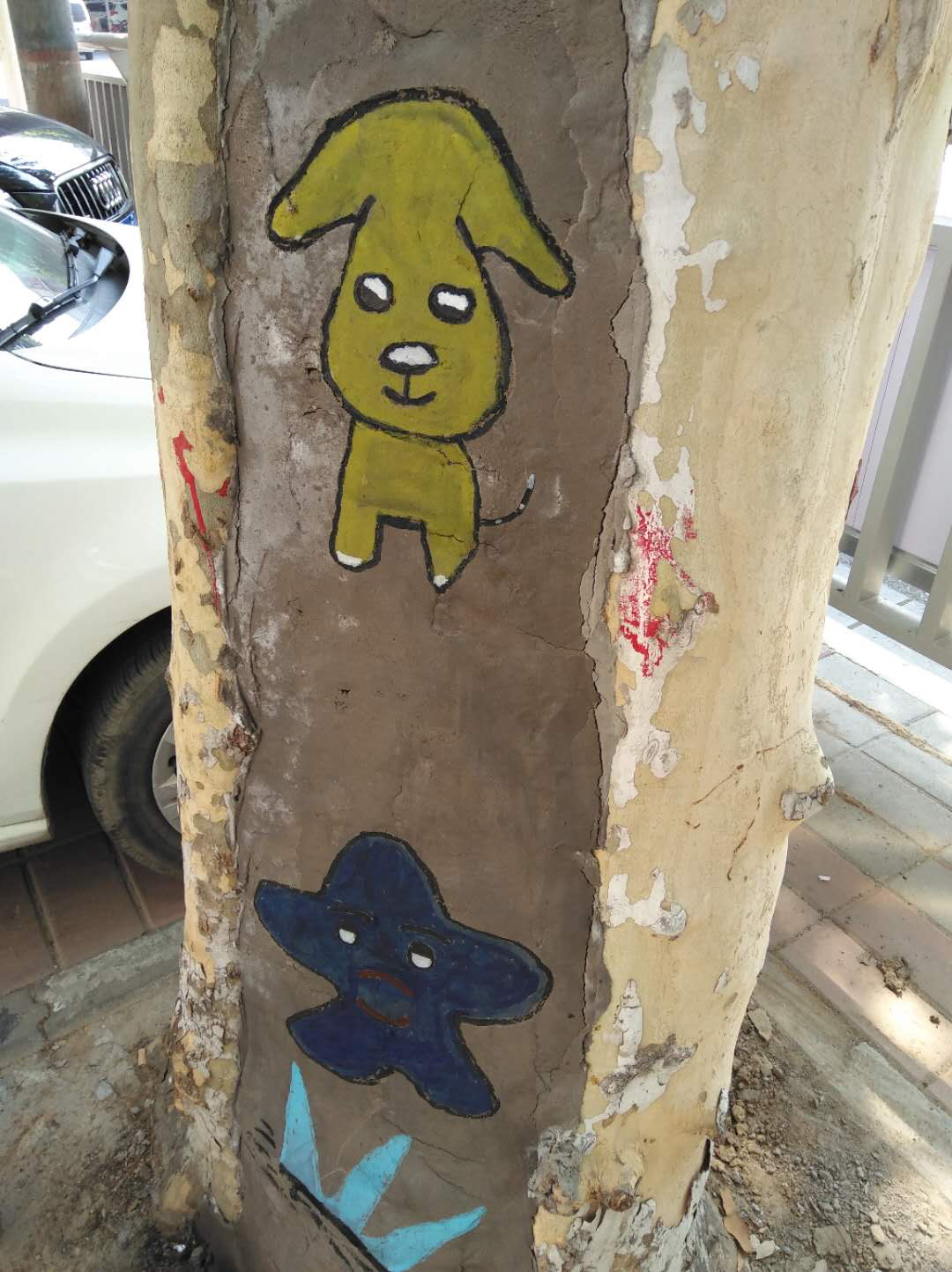 纬五路上的空洞树已经修复,工人在修补处画上卡通画