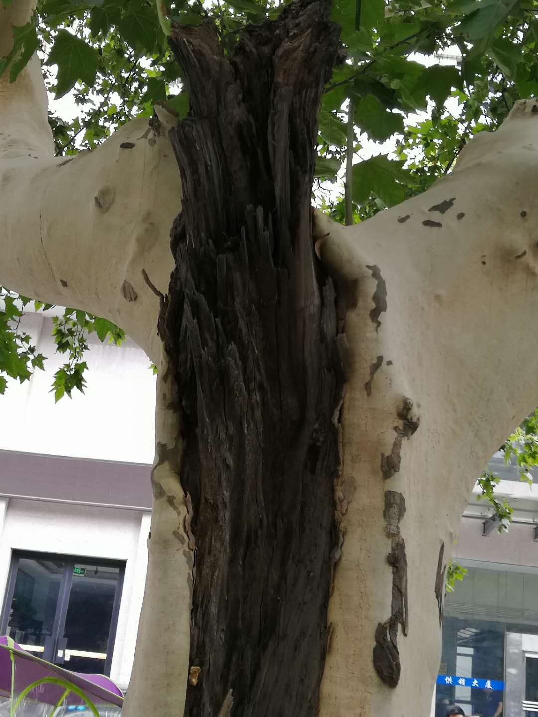 据工作人员介绍,2000年,为减少法桐的种球,绿化部门对黄河路、南阳路等路段的法桐进行了嫁接,主干以上部分枝干全部修掉,采用劈接的方法进行嫁接。由于部分接穗与砧木没有完全愈合,一些树在分枝点处形成了树洞,导致树体腐烂。
