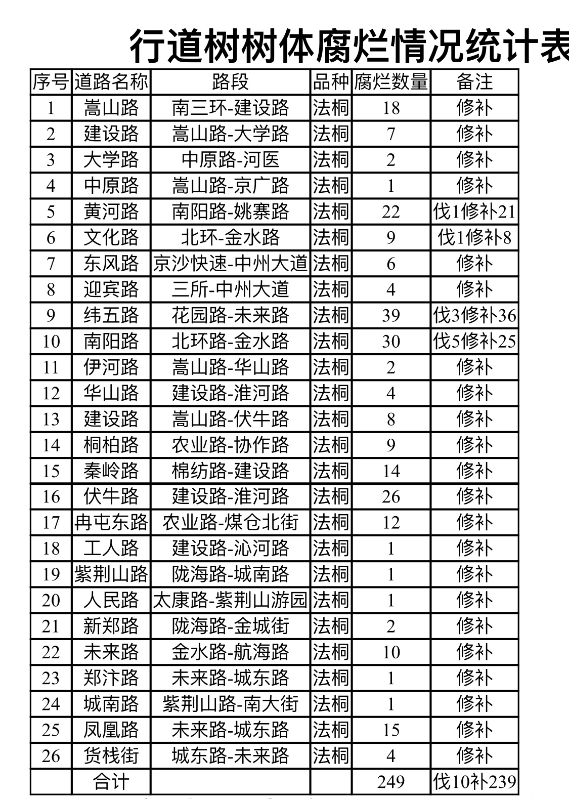 这次调查发现的行道树树体腐烂较多的道路有26条,共有249棵出现腐烂的法桐树。其中嵩山路、黄河路、纬五路、南阳路等道路上的法桐树体腐烂株数较多。这些道路上的行道树大部分是在上世纪60-70年代栽植的,距今树龄已经有50-60年。因此树木腐烂与树龄、胸径、施工断根、截枝等有着密切的关系,在同样条件下,树龄、胸径越大腐烂的越多,腐烂率随树龄的增长而增长。