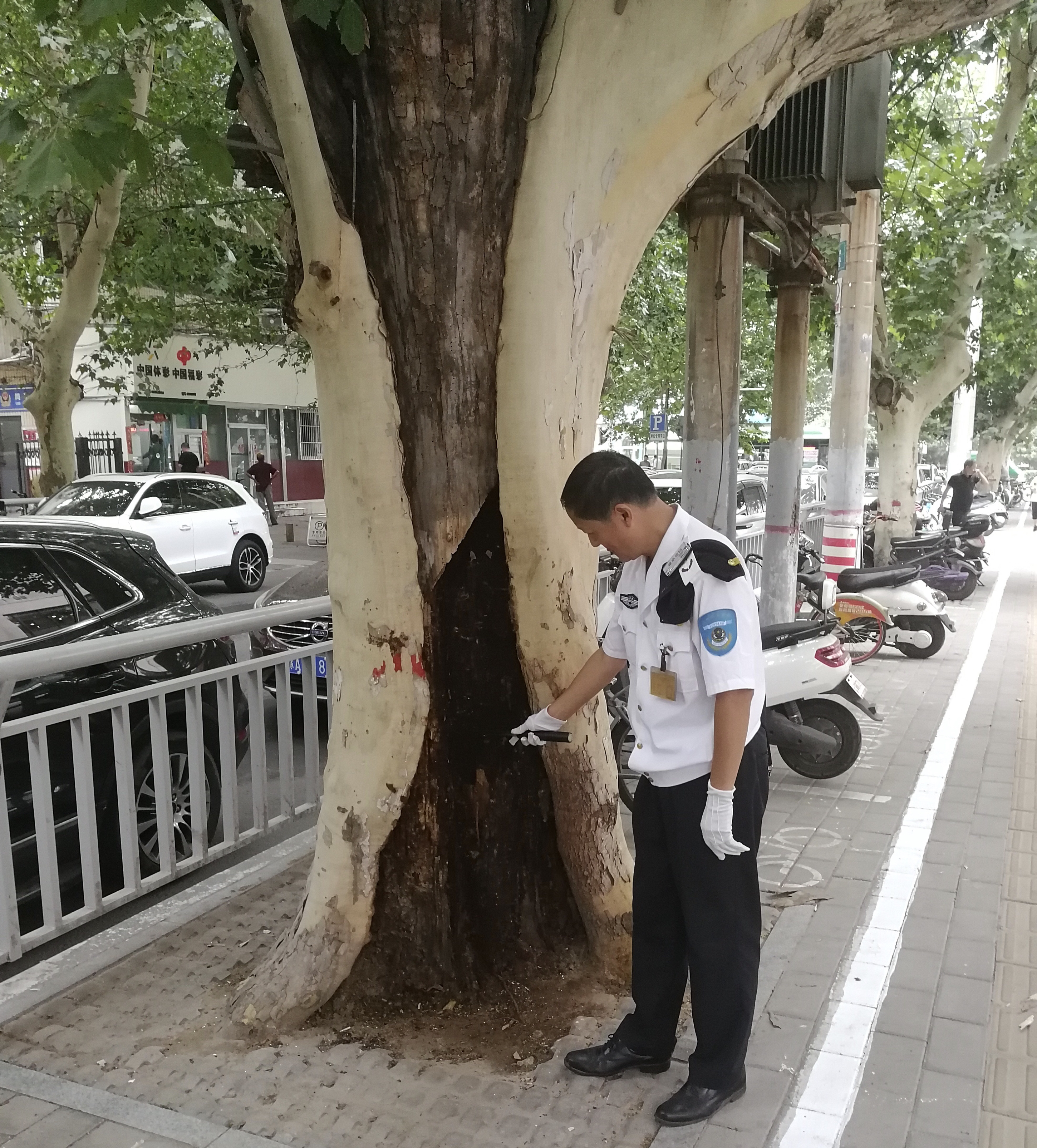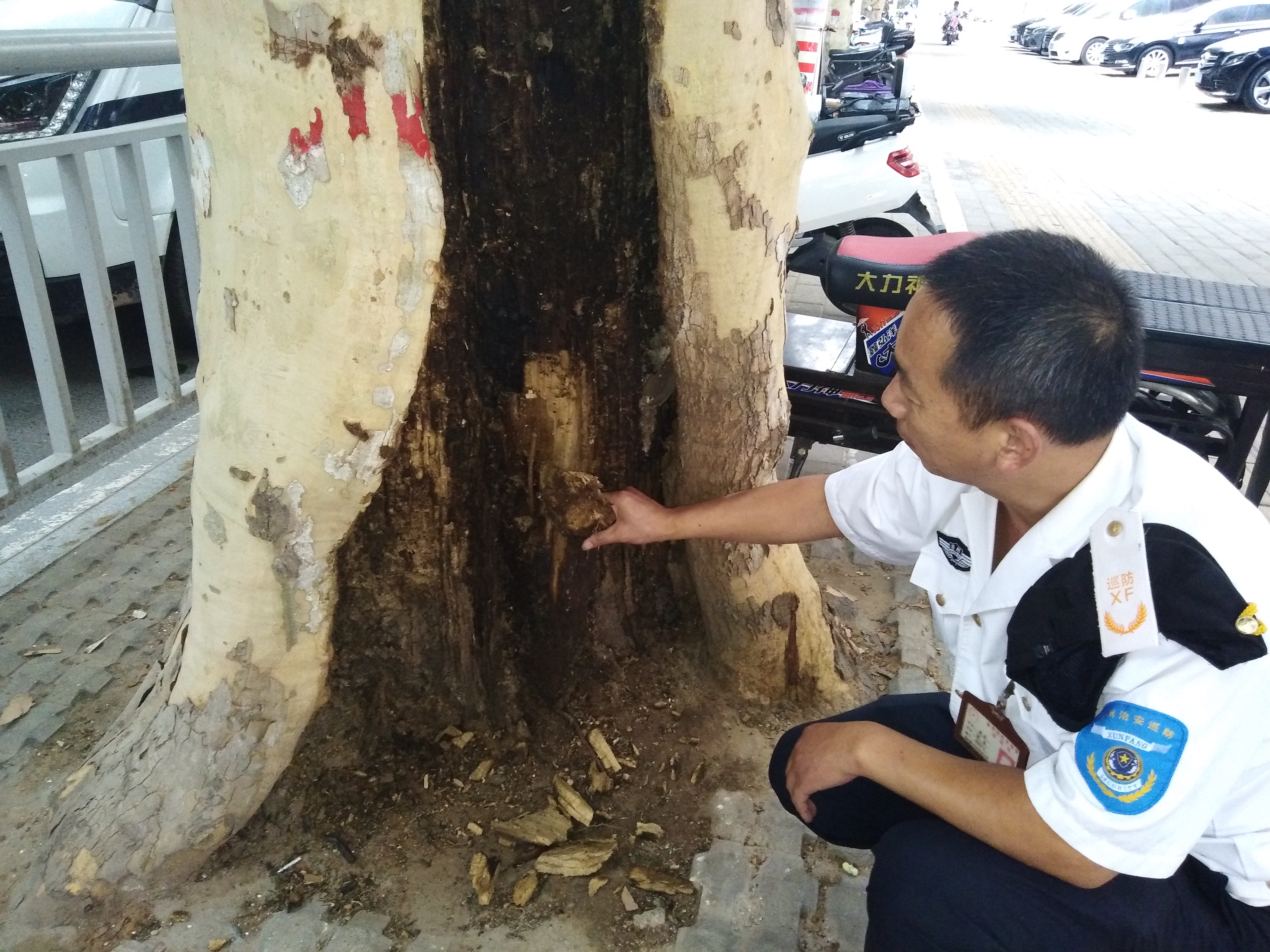 在路上巡逻的金水区花园路办事处巡防队员孙胜利等人,指着一棵被树干内部腐烂严重的大树告诉记者,前段时间连续下雨,郑州市区有200多棵大树在狂风暴雨中被刮断倒下,因平时天天在纬五路上巡逻,知道这条路上有十余棵法桐行道树是空洞树,所以平时就加大了对该路段的巡逻,及时提醒行人不要靠近这些有安全隐患的大树,尤其是不要在这些树旁边逗留、停车。