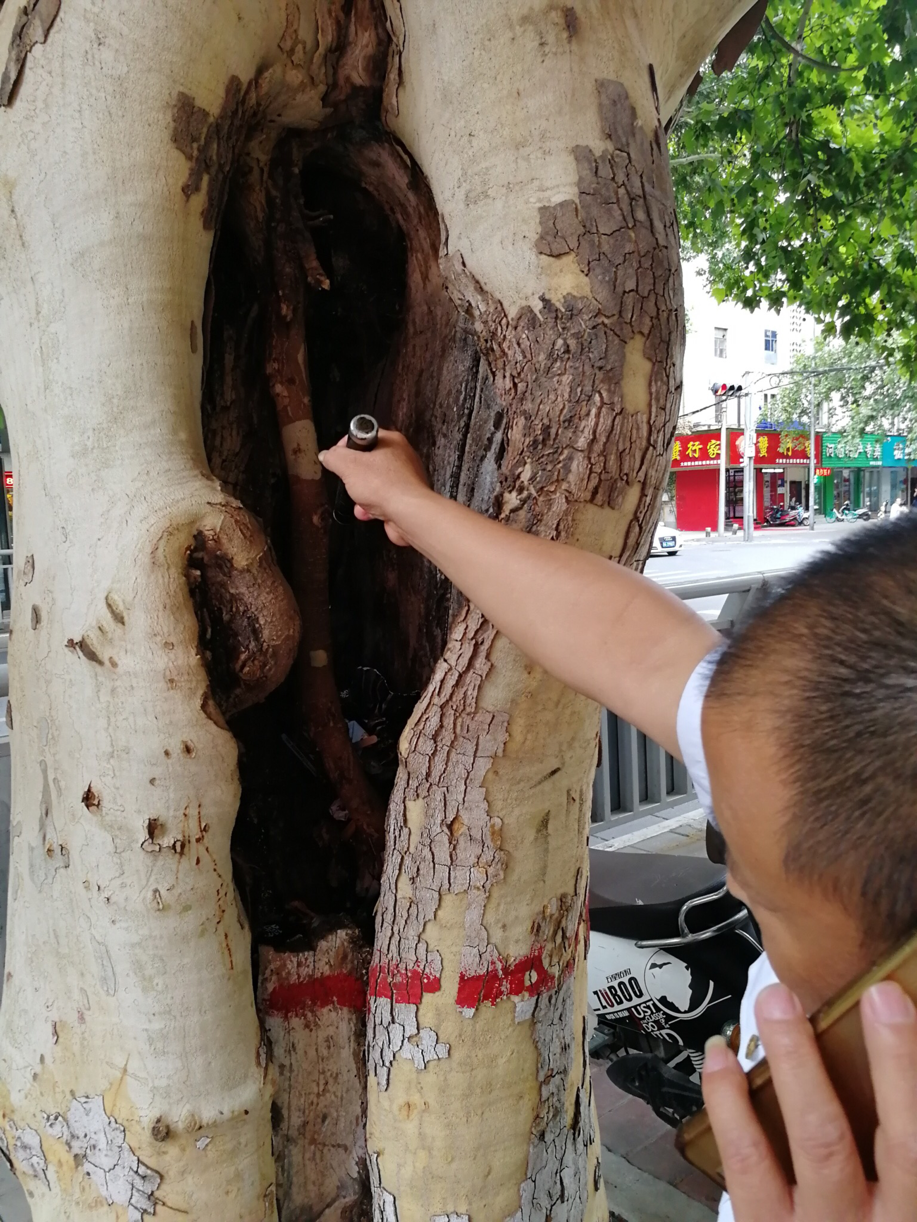 9月5日下午,记者首先来到市民反映空洞树较多的郑州市纬五路。发现这些树干腐烂被虫蛀的行道树,都是一些树龄较大的法桐树。有的树干中只有局部的空洞,有的空洞则贯通了整个树干,看着令人触目惊心。据附近居民介绍,这些法桐树大多是上世纪六十年代前后栽种的,树龄有五十左右。由于枝繁叶茂,每年夏天都会给市民带来大片的荫凉。然而,一些老树因多年遭受害虫蛀蚀,树干中间出现腐烂和空洞,导致头重脚轻,一遇狂风暴雨,随时有断裂倒下的可能。