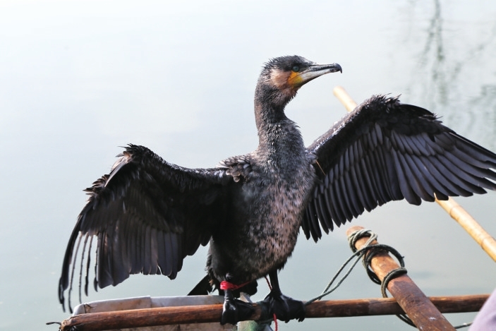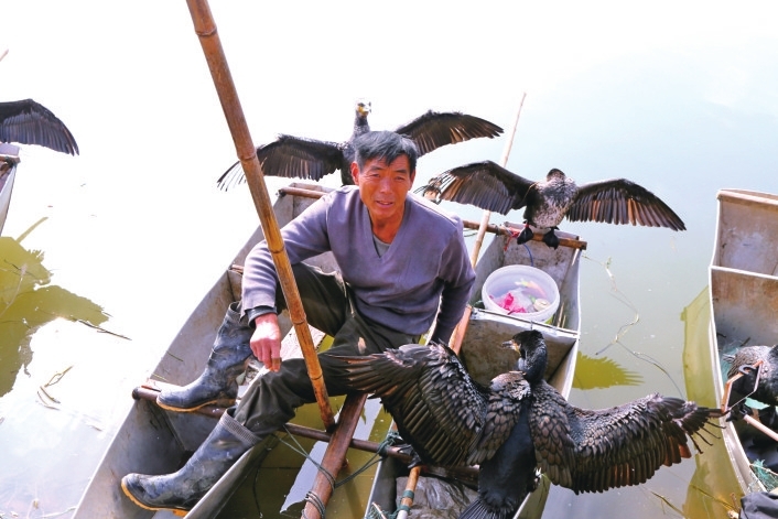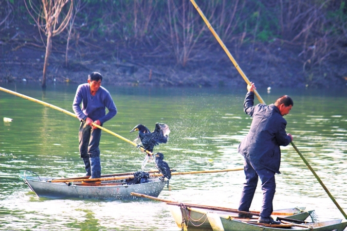 不停挥动手中的竹竿,驱赶鱼鹰不能上船歇息,同时还要喊着号子助兴,这时候的画面用群情激昂描绘,是最恰当不过的。鱼鹰的喉结处系有铁丝,防止捕鱼后“私吞”。发现哪只鱼鹰有了收获,渔民会迅速操起网兜把鱼鹰连同含在嘴里的鱼一起捞上船,然后用手握着鱼鹰的喉部,挤出鲜鱼,再放鹰下水,如此反复,完成一次次捕鱼。