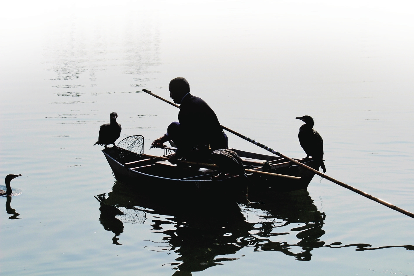 渔民和鱼鹰休息时,湖面上一片宁静。