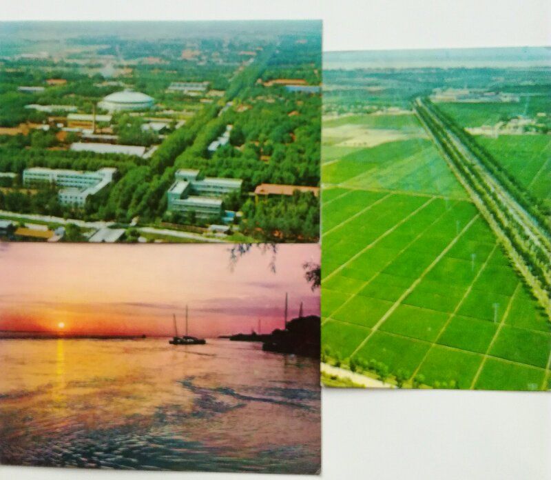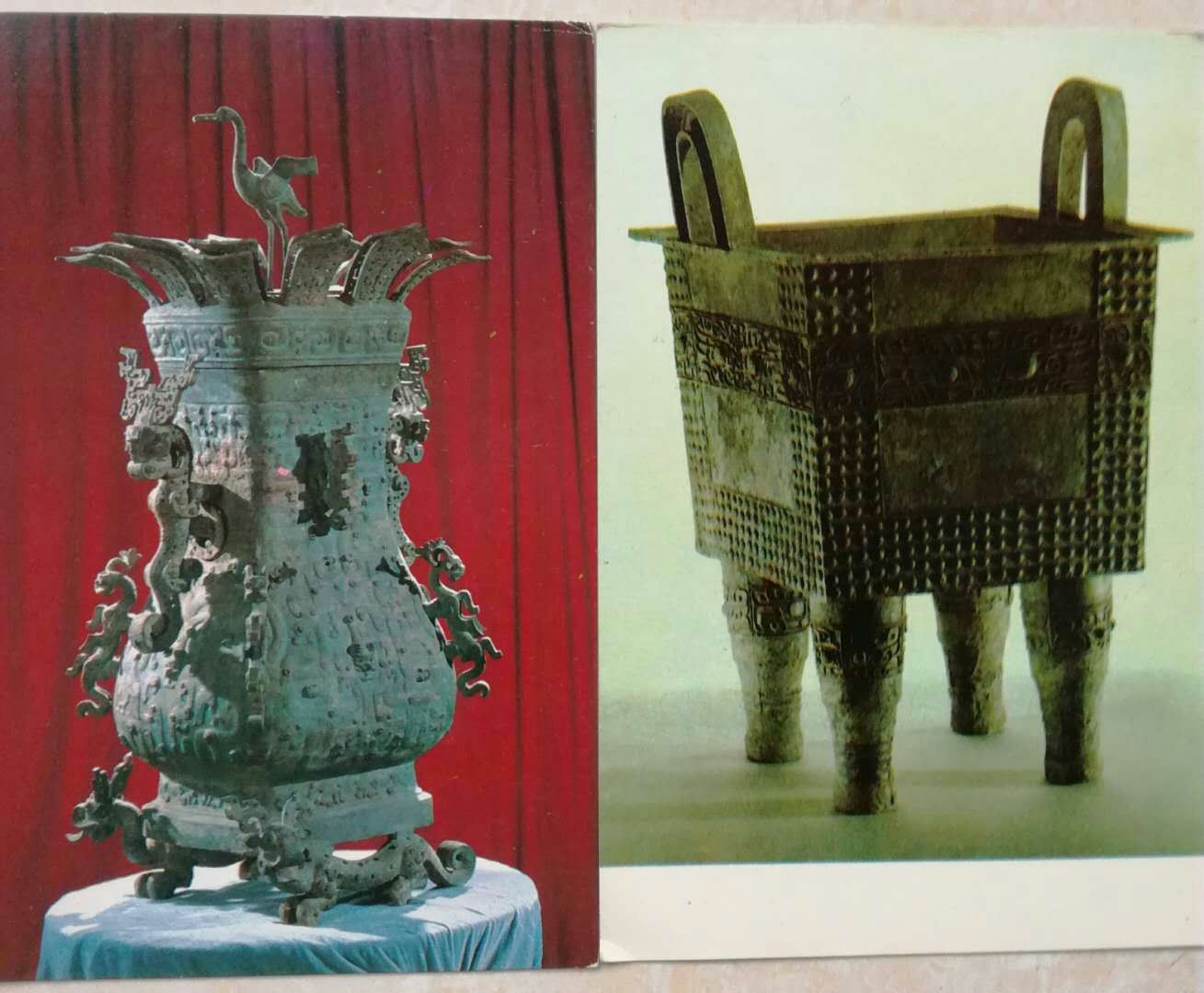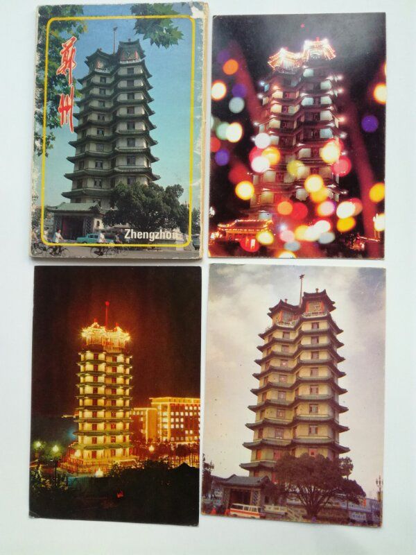 在这些明信片当中,有在郑州出土的国宝级文物莲鹤方壶和商代铜鼎的照片,有大河村遗址的照片,有反映郑州农村面貌和红红火火的工业战线面貌的照片,有反映郑州市体育场馆和黄河景色的照片,还有新颖、独特、雄伟、壮观的二七双塔照片等等。