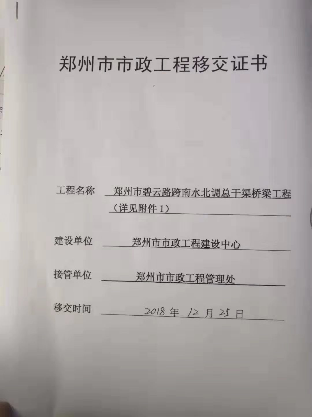 该大桥到底该由谁来管?21日,郑州市城乡建设局有关负责人回复记者称,经调查,该大桥已于2018年12月由建设方移交至郑州市市政工程管理处,并向记者出示了一份《郑州市碧云路跨南水北调总干渠桥梁工程移交证书》。记者在该证书上看到,建设单位郑州市市政工程建设中心已于2018年12月25日将该工程正式移交给郑州市市政工程管理处。而该证书上也分别盖有建设方、施工方以及接管单位的公章。
