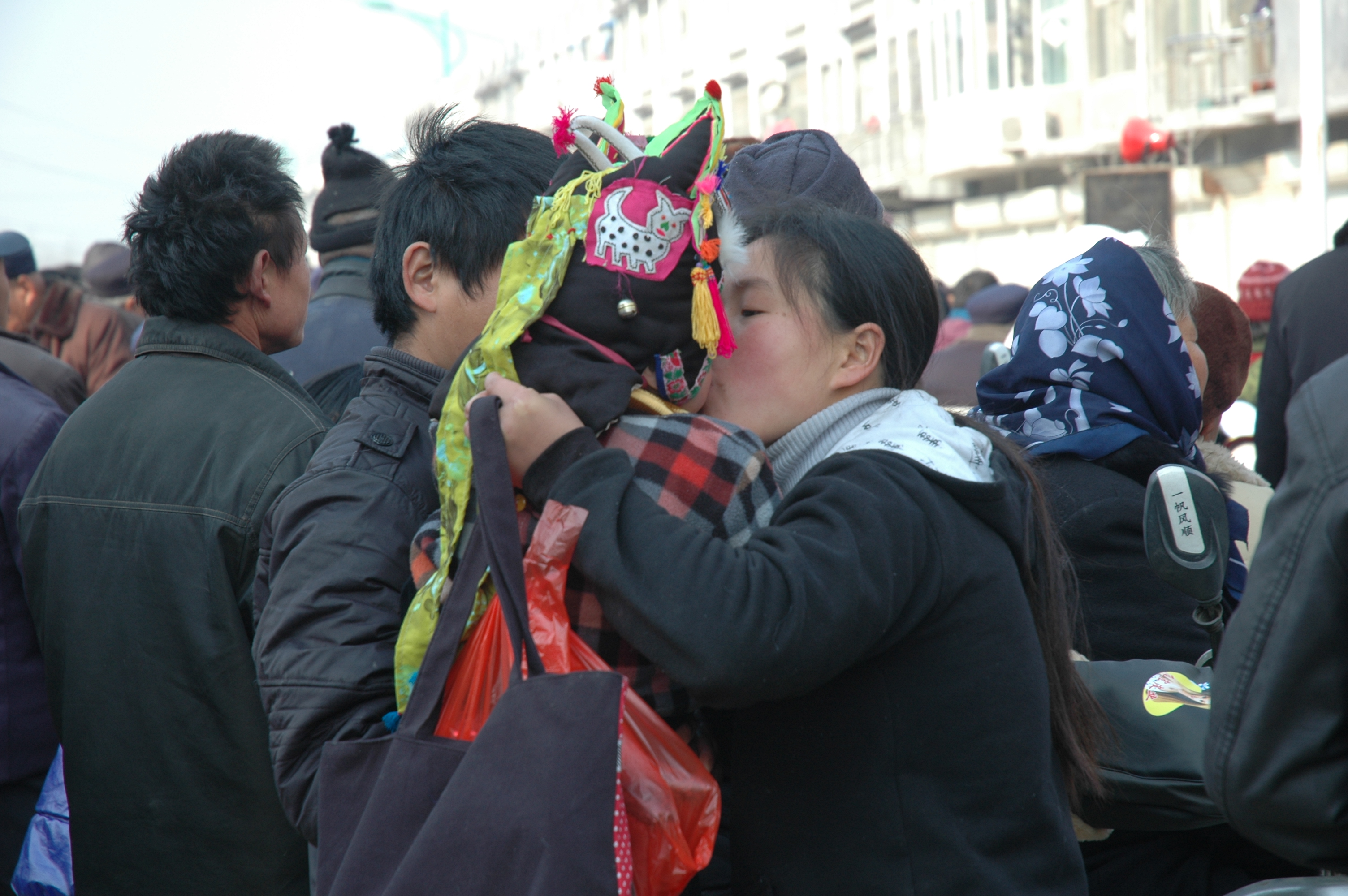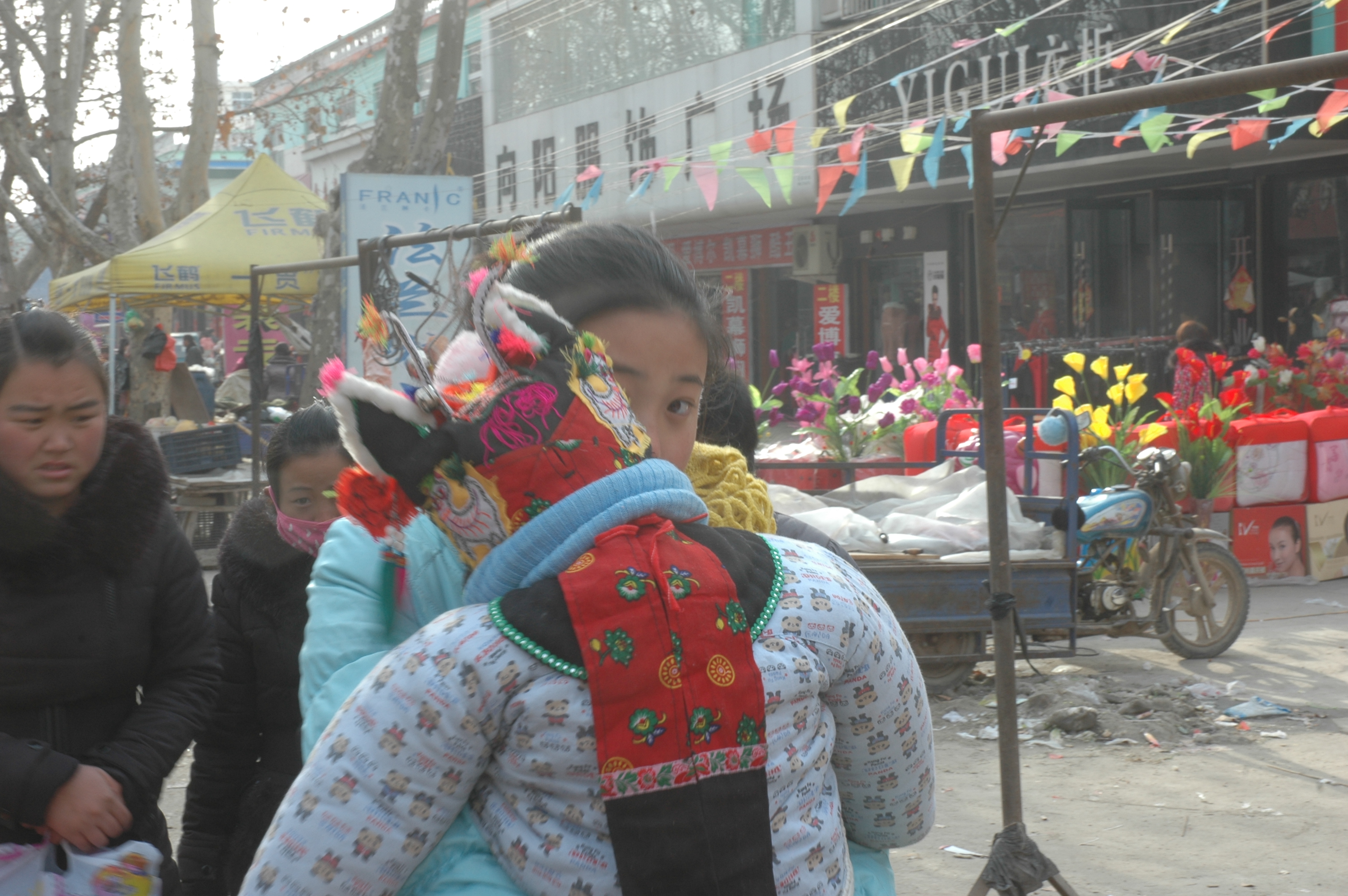 乡镇的街道里,泛红的行人面庞说明天气寒冷。戴着虎头帽的娃娃穿的严严实实,虎头帽配上蓝围巾,在妈妈怀里很放松。