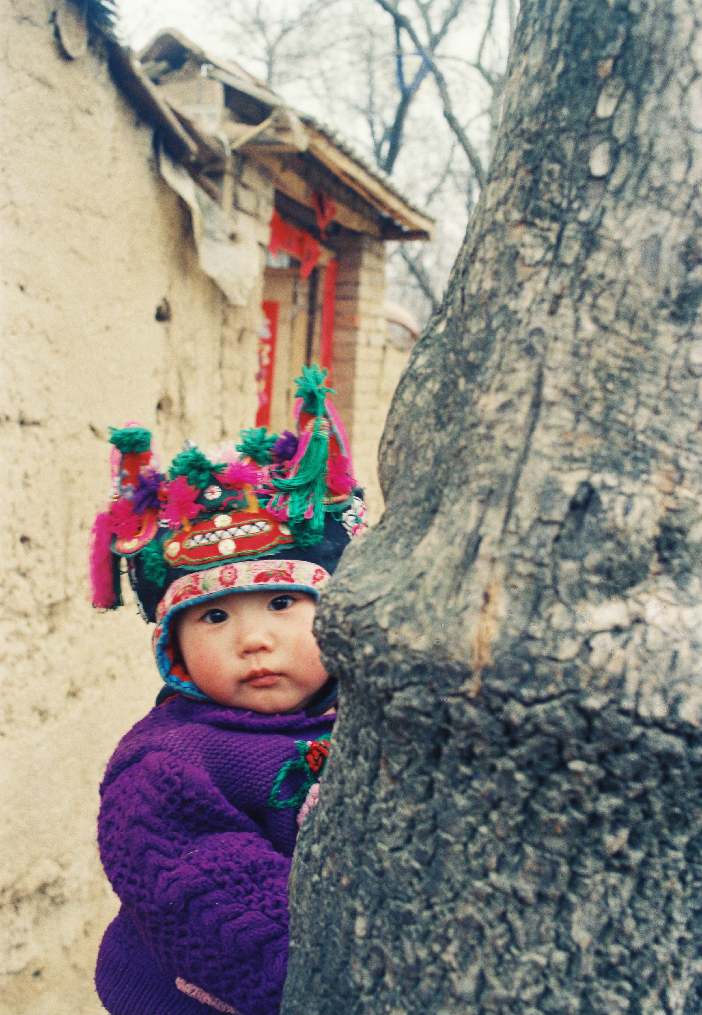 贴着大红春联的家门口,躲在槐树旁的娃娃,眼神纯净。