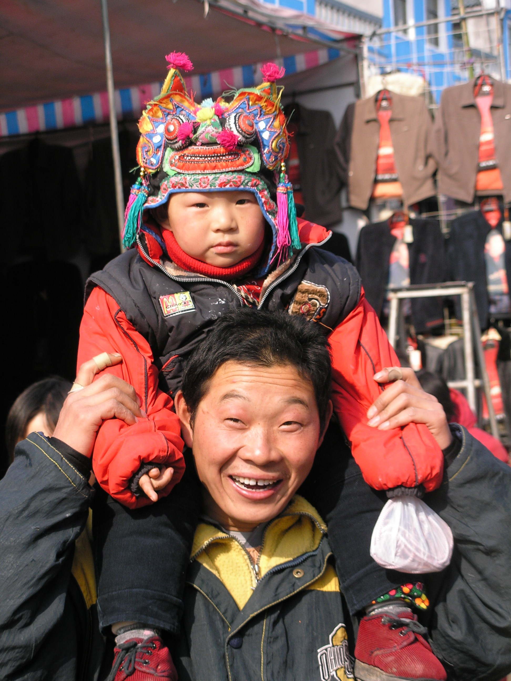 乡镇的街道里,戴着虎头帽的娃娃,骑在爸爸脖子上。拉着孩子两只胳膊的老爸笑开了花。怕冷的娃娃,双手缩进了袖腿里,而爸爸手指上缠着冻疮纱布。