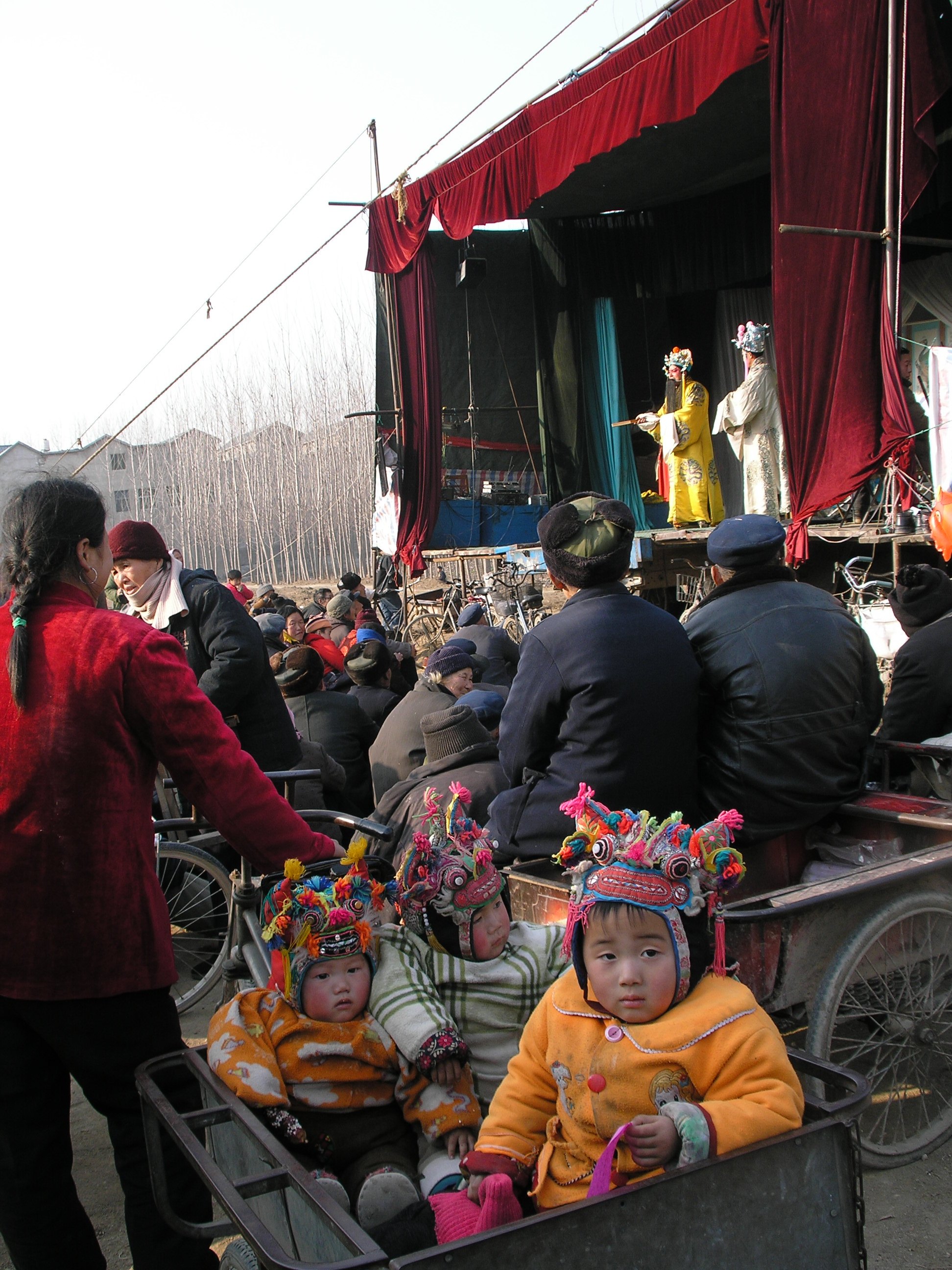 妈妈骑着三轮车来看戏,车斗里坐着三个娃娃,五颜六色的虎头帽造型各异。