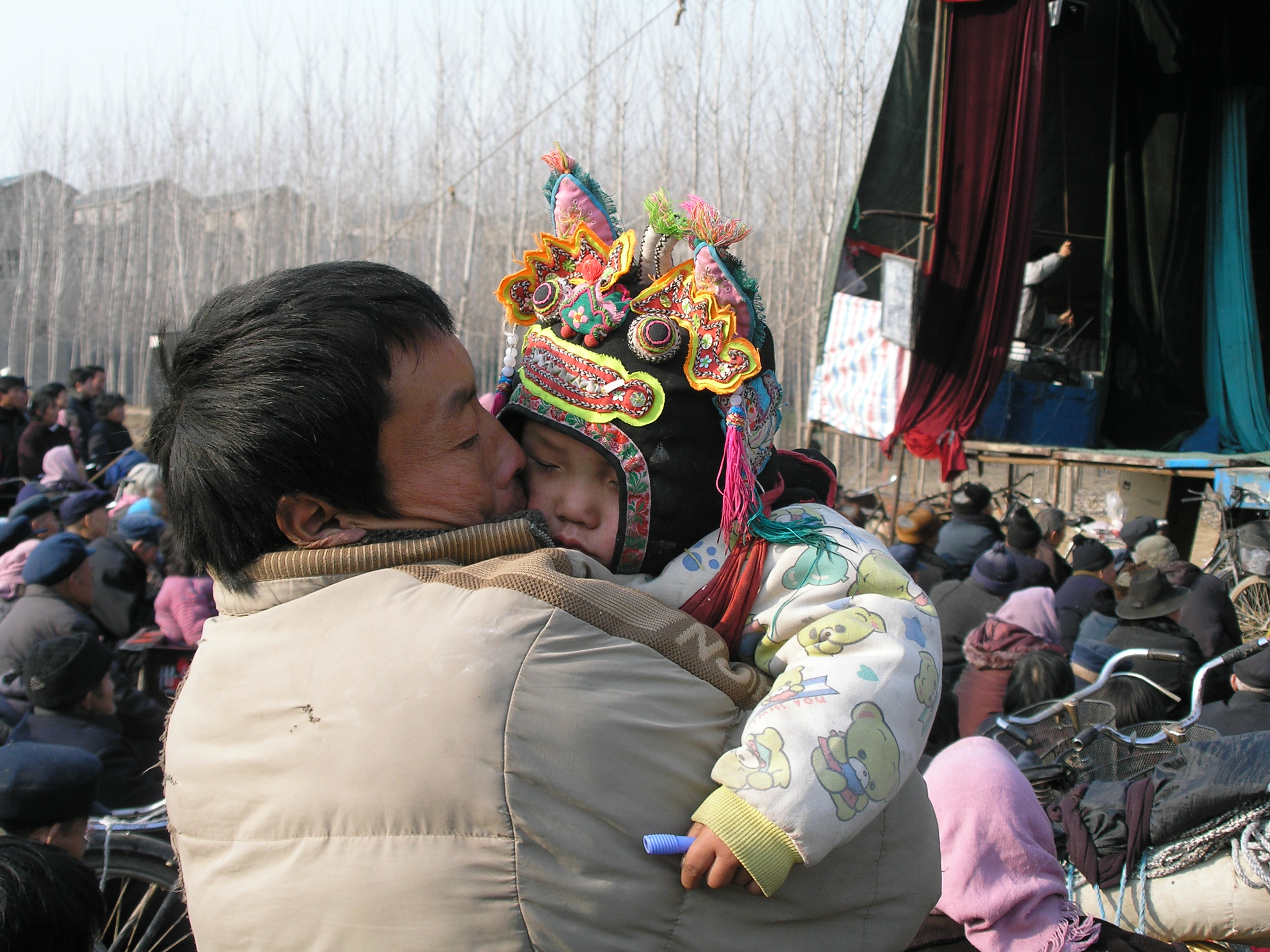 戏台观众席里,戴着虎头帽的娃娃在爸爸怀里入睡,衣服有些脱线的爸爸,在孩子脸庞轻轻一吻。