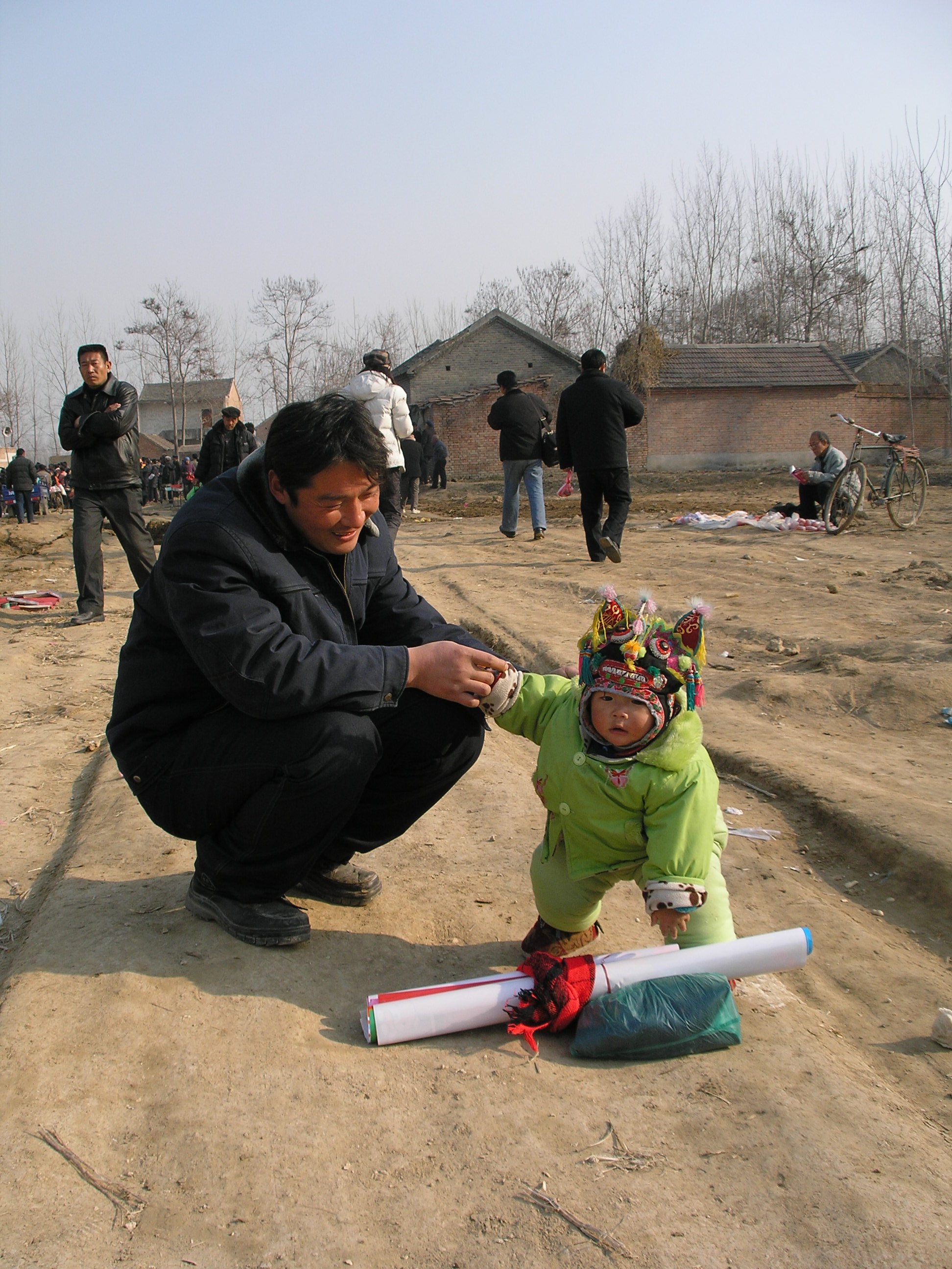 村口的土路上,赶完集回家的父子俩,看着掉落地上的春联,娃娃似乎跃跃欲试想伸手提。