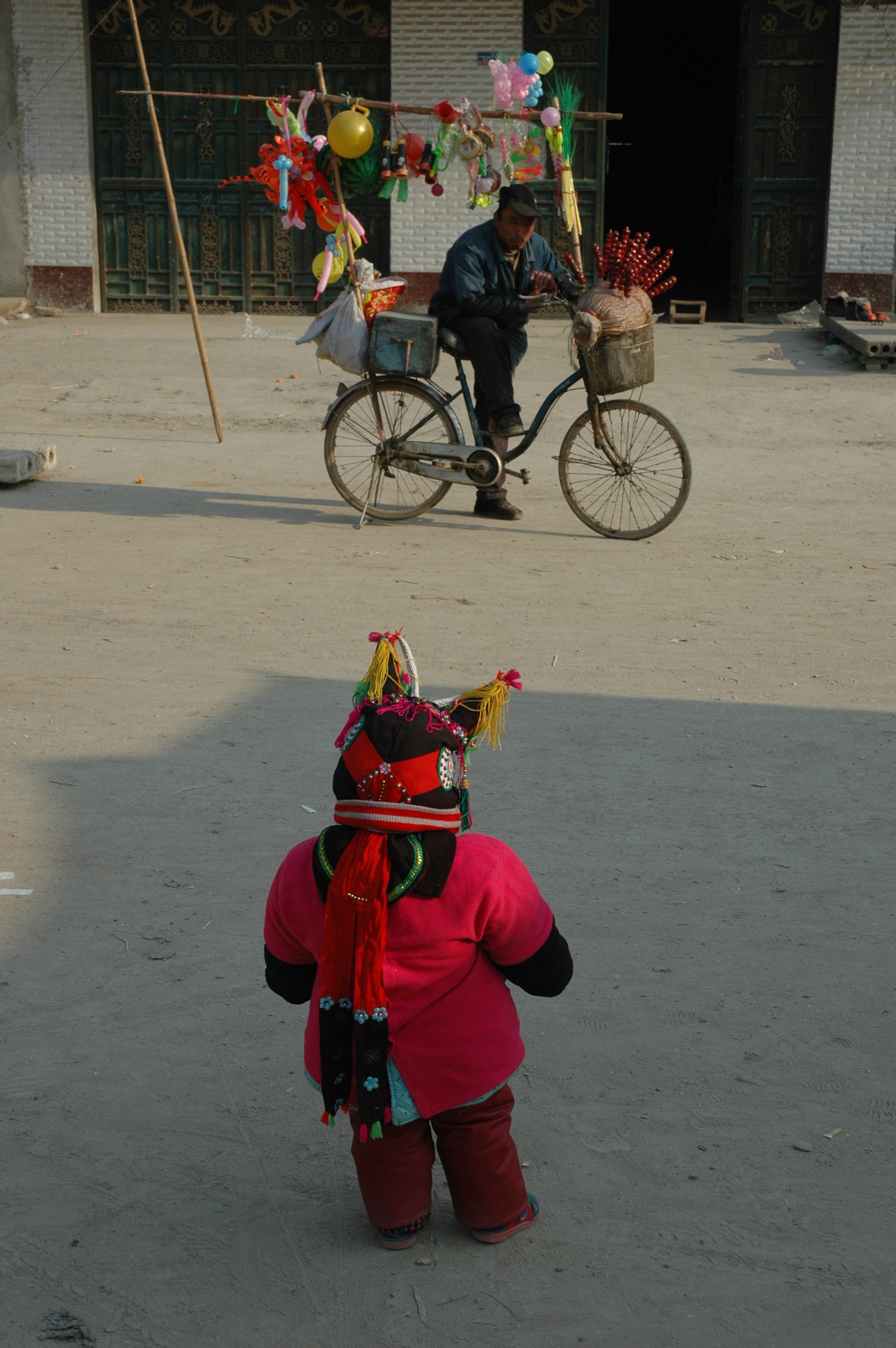 骑着自行车穿乡过村的货郎,货架上插满花红柳绿的拨浪鼓、气球,还有诱人的糖葫芦,引逗得虎头帽娃娃目不转睛。
