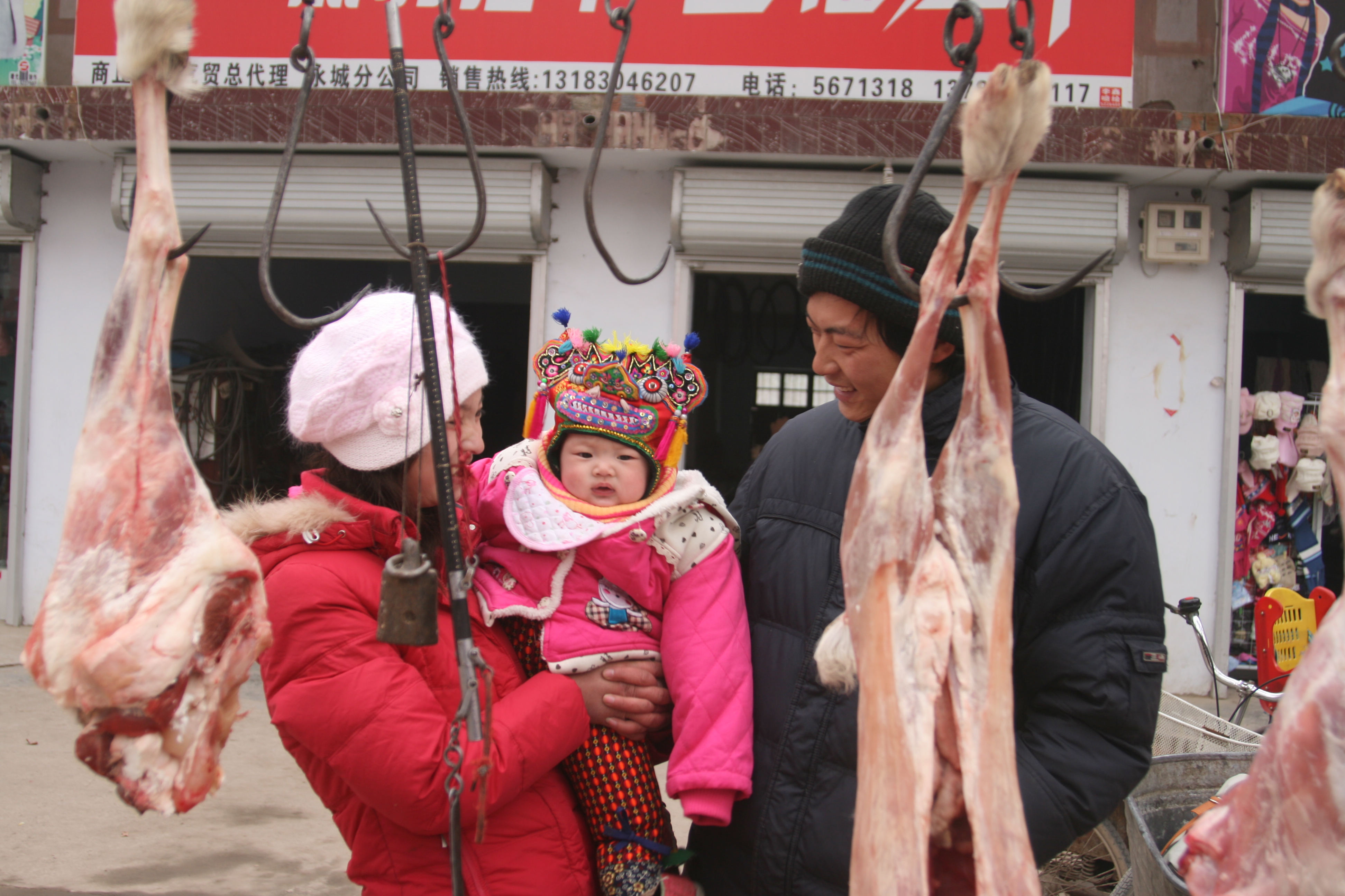 集市上的肉摊前,年轻父母疼爱的眼神,笑着看着怀里的孩子,一家三口身上穿着过年买的新衣裳。爱美的妈妈戴着粉红色的毛线帽,女娃的虎头帽色彩斑斓,精致又好看。