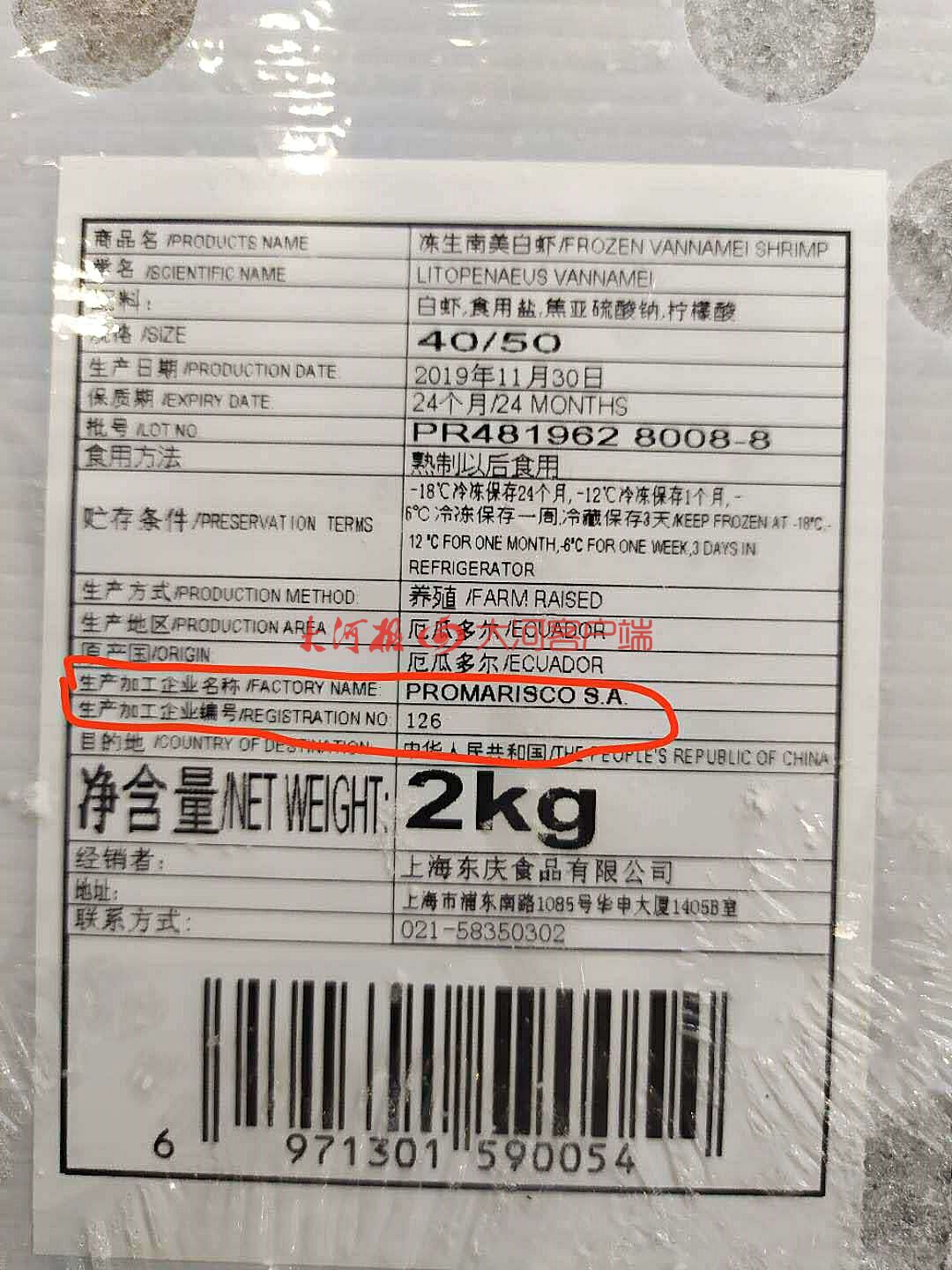 “7月10日冷冻虾检测到病毒的消息发布后,我们专门对比了一下,销售的虾虽然来自厄瓜多尔,但并不属于检测到疫情的那三家企业。”张晓说。根据张晓提供的标签,这批虾来自厄瓜多尔,但生产加工企业位PROMARISCO S.A, 编号为126,由此可见,这批虾并不是来自检测到疫情的三家工厂。