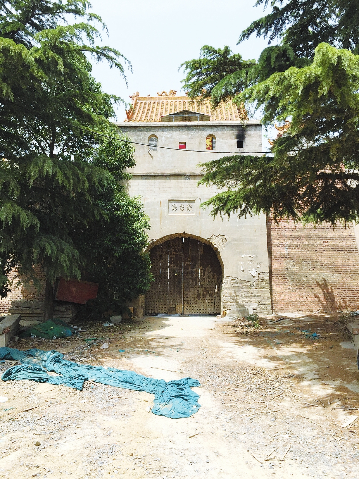 5月9日上午,记者在中原西路北侧的西流湖公园内,找到了保吉寨的寨门和寨墙。寨门有两层门楼,由青砖垒成,门为木制,左右两扇,门洞上方有“保吉寨”三个字。透过门缝往里看,寨内已经一片平地,没有建筑。