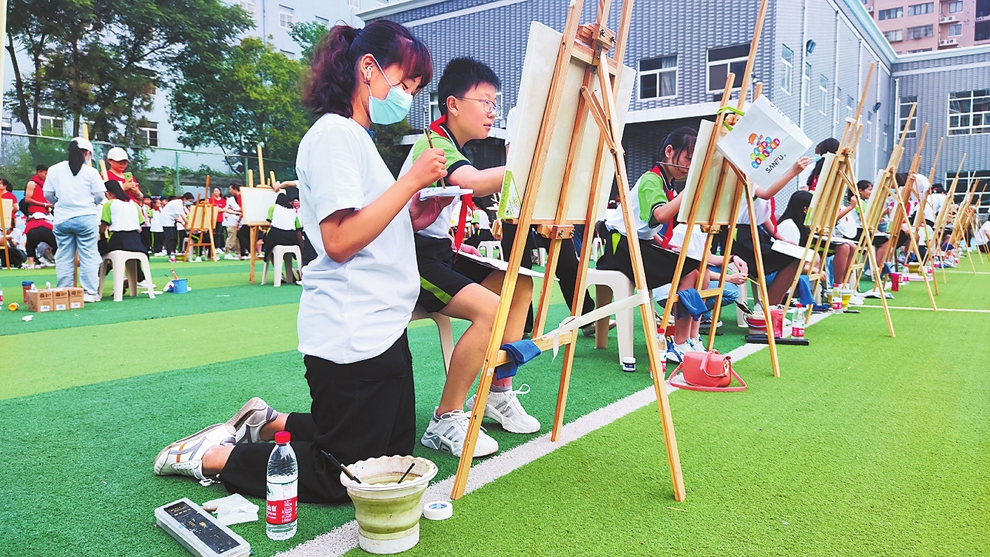 捏起画笔,蘸上颜料,绘出感动。6月18日上午,河南师范大学百名大学生走进新乡市红旗区世青国际小学,和百名小学生一起,以百年党史为主题,共同绘出百幅美丽图画。