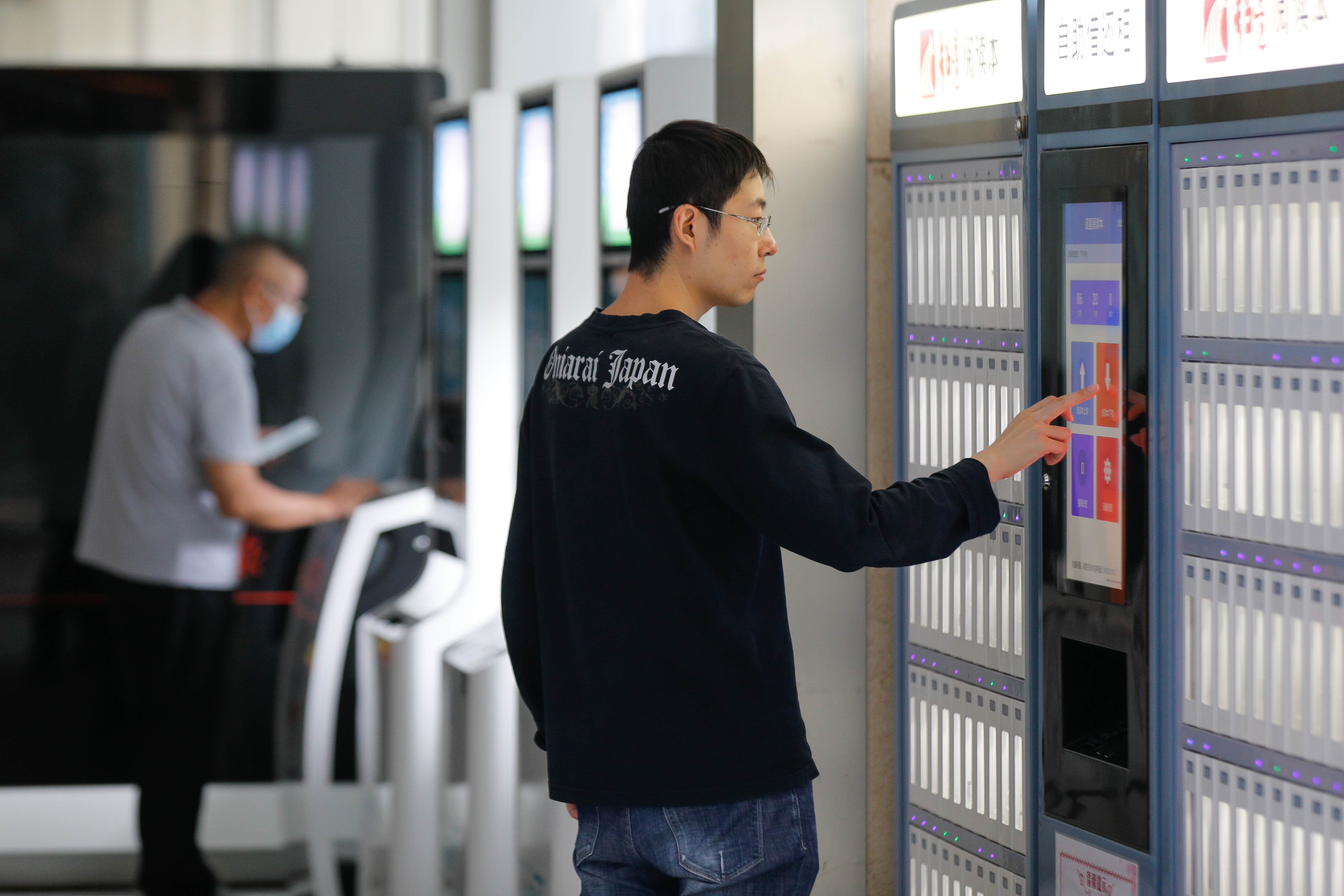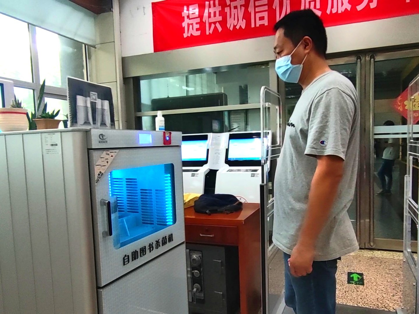 还书前,一位读者正在将书放入“自助图书杀菌机”里进行消杀