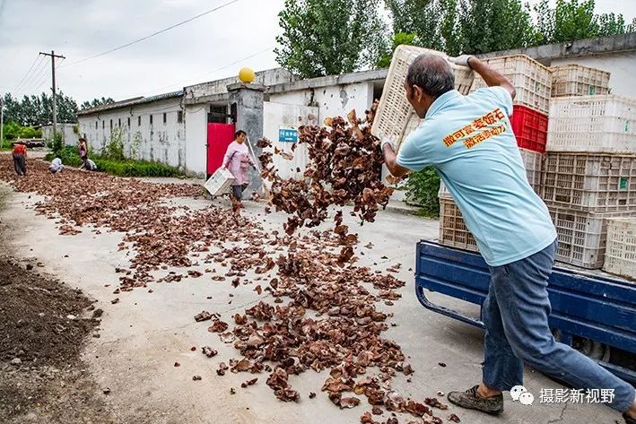 村里建起了食用菌专业合作社,生产平菇、双孢菇和木耳,一个大棚一季可产7万斤。一位大伯正在晒场上晒木耳,您看他干起活来多带劲。
