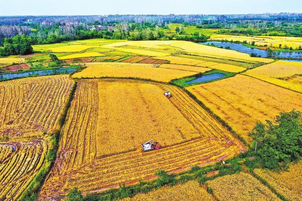 9月30日,光山县罗陈乡张楼村青龙河合作社,当地农民利用晴好天气加紧收割水稻。
