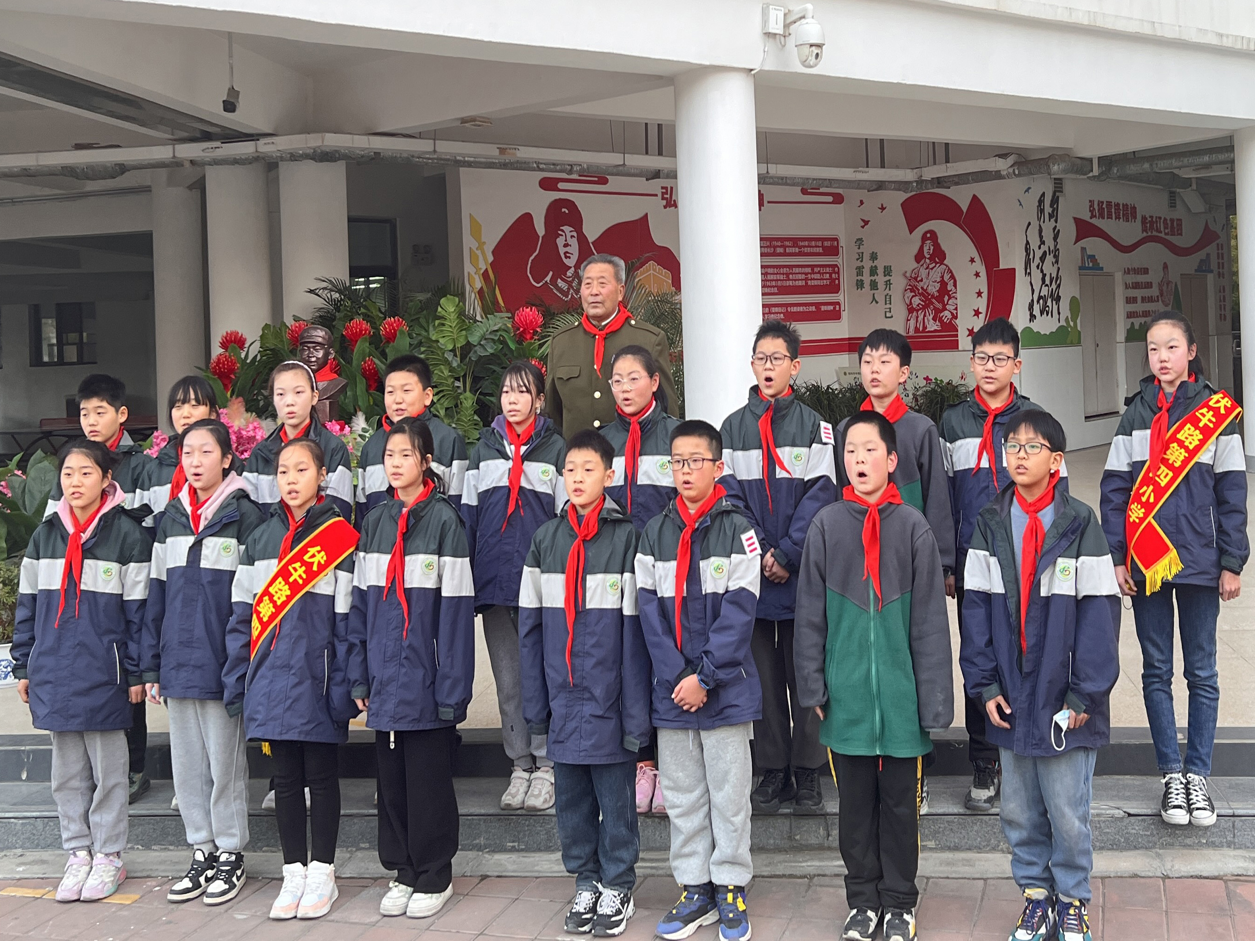 悠悠岁月,厚重绵长。武老师用生动的语言讲述了杨靖宇、董存瑞、刘胡兰等英雄事迹,还分享了自己40多年前经历的越南自卫反击保卫战,武老师说:在每次战斗前战士们都会写一封遗书,做好为国牺牲的准备。队员深情的念着武老师战友的亲笔遗书,一字一句,无不展现着战士的爱党、爱人民的朴素情怀。武老师还讲述了战场上“半瓶罐头”和“那块黑色塑料布”背后的故事,队员们听后不禁潸然泪下,并为武老师送上鲜花,表达对老战士的崇敬之情。最后,武老师向队员们发出号召:希望队员们感党恩,听党话,跟党走,当好红色接班人。