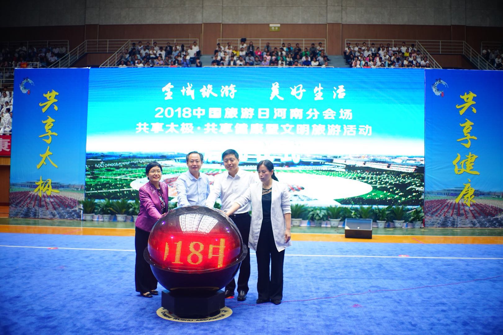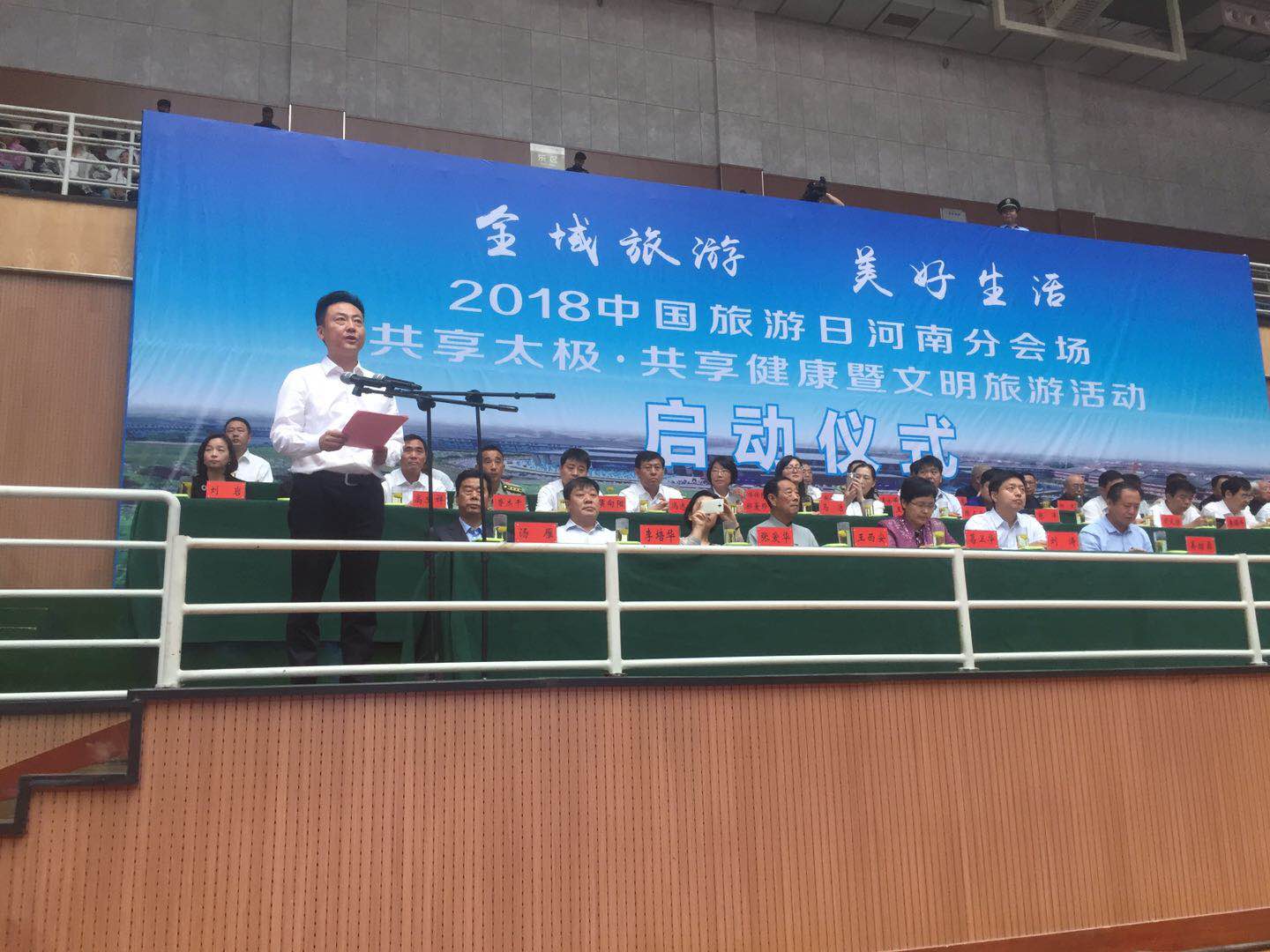 大河网讯 5月19日,2018中国旅游日河南省分会场活动在焦作温县和信阳新县同时启动。河南省旅游局局长姜继鼎、焦作市委副书记刘涛、焦作市常务副市长杨青玖、河南省文明办副主任葛卫华、温县县委书记王玲等领导出席在温县举办的“共享太极.共享健康暨文明旅游”活动启动仪式;河南省旅游局副局长李延庆、信阳市副市长邵春杰、信阳市旅游局局长童光亮、信阳市体育局局长刘敏、新县县委书记吕旅等领导出席在新县举办的“2018中国旅游日河南省新县分会场主题活动”。