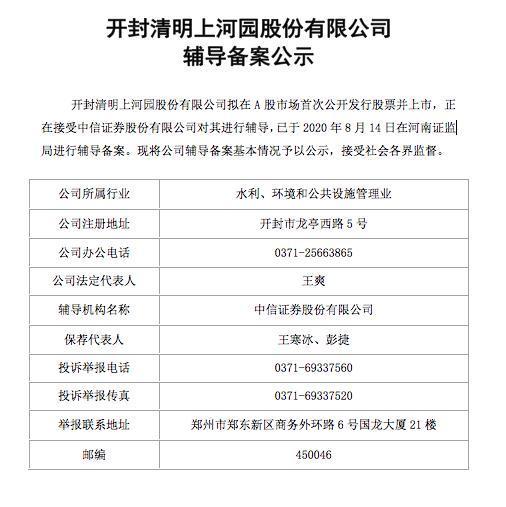 大河网讯 (记者 李中海) 据河南证监局发布公告显示,开封清明上河园股份有限公司拟在A股市场首次公开发行股票并上市,正在接受中信证券股份有限公司对其进行辅导,已于2020年8月14日在河南证监局进行辅导备案。现将公司辅导备案基本情况予以公示,接受社会各界监督。