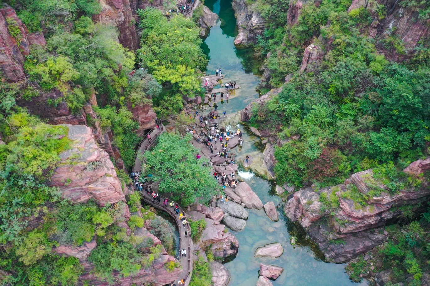 ▲游客在云台山红石峡山水之间游玩拍照,不亦乐乎。